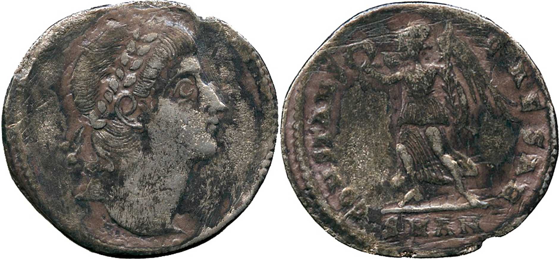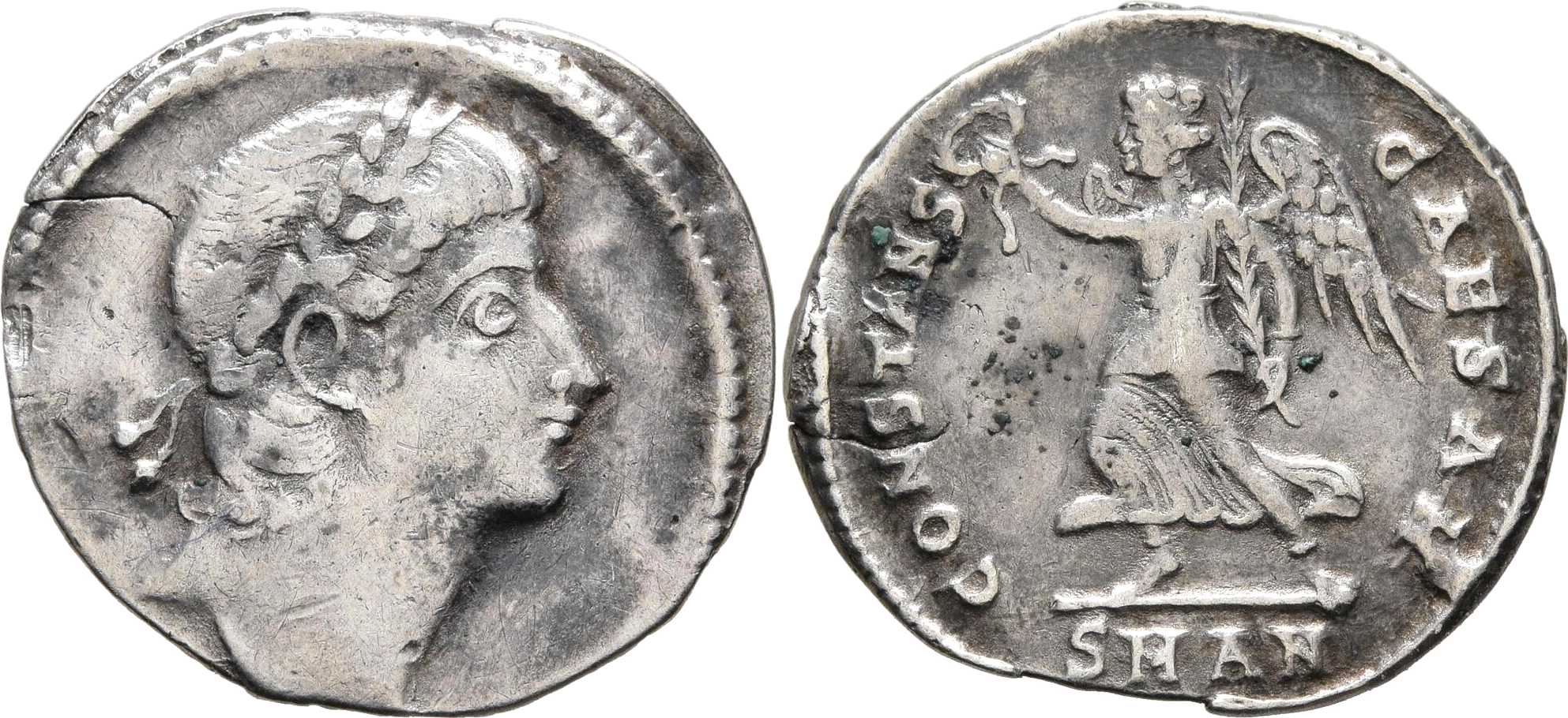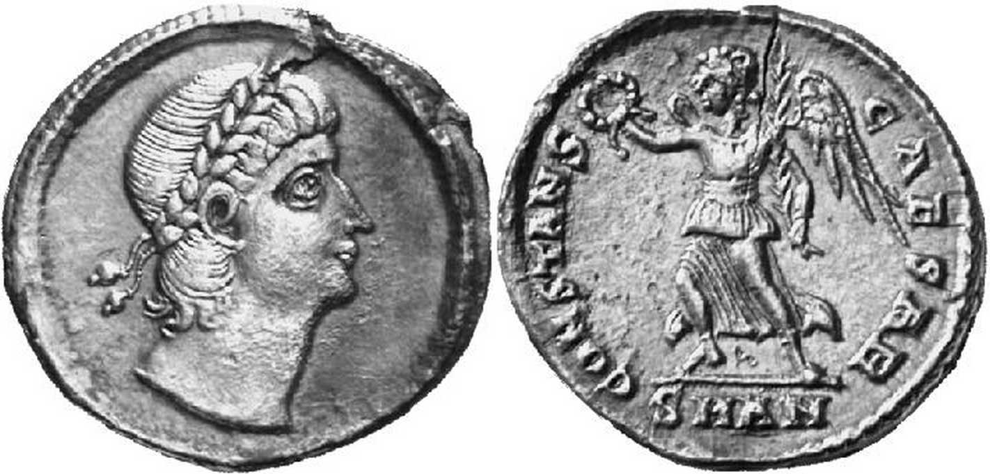 CONSTANS-CAESAR [CONSTANS CAESAR]; Victory advancing l., holding wreath and palm branch. SMAN in exergue.