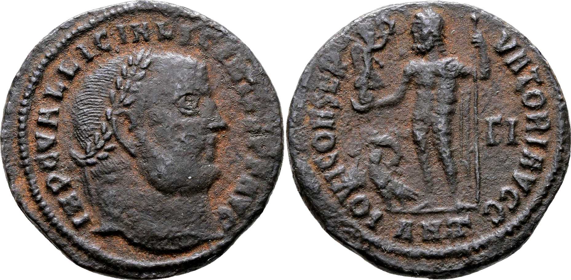 IOVICONSER-VATORIAVGG [IOVI CONSERVATORI AVGG]; Jupiter stg. l., chlamys across l. shoulder, leaning on sceptre, Victory on globe in r. hand; eagle with wreath to l. on ground. ΓI in right field. ANT in exergue.
