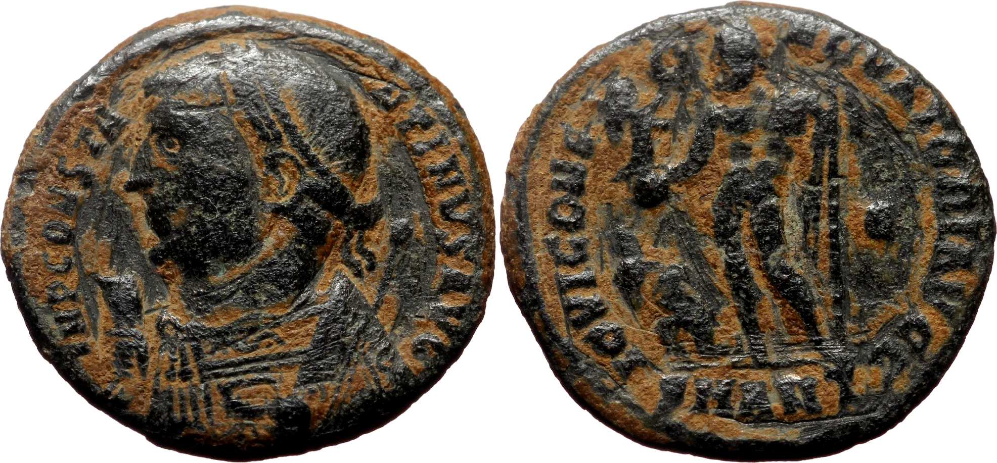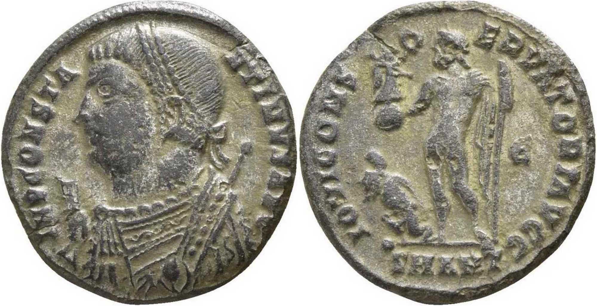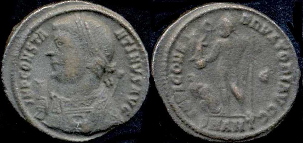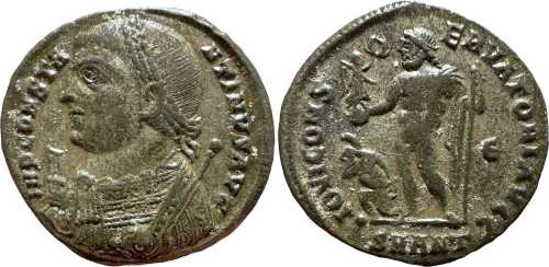 IMPCONSTA-NTINVSAVG [IMP CONSTANTINVS AVG]; bust l., laur., dr., globe, sceptre in l. hand, mappa in r. hand.
