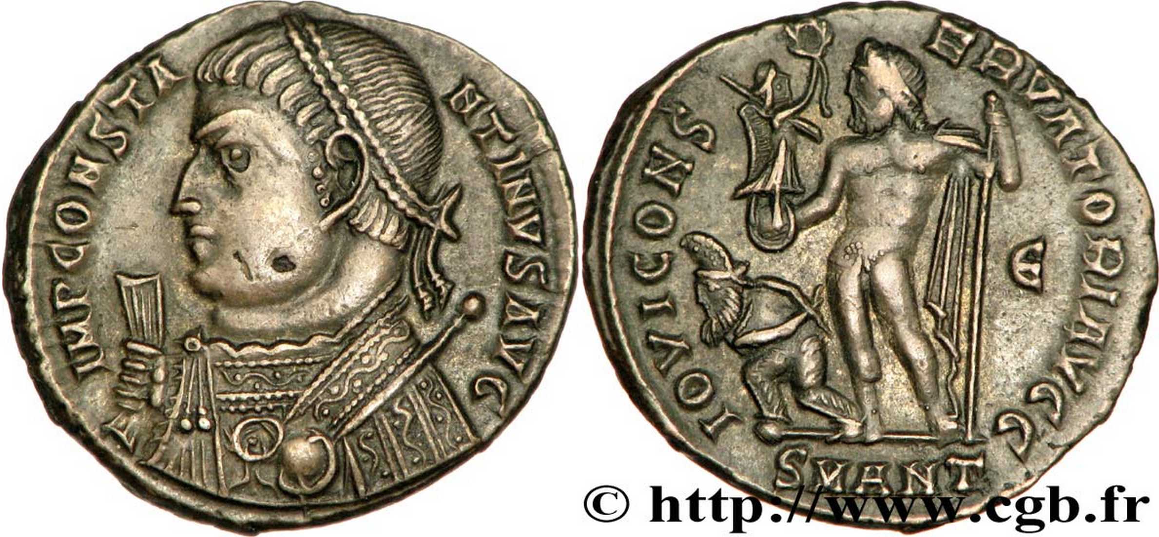 IOVICONS-ERVATORIAVGG [IOVI CONSERVATORI AVGG]; Jupiter stg. l., chlamys across l. shoulder, leaning on sceptre, holding Victory on globe; to left captive. Є in right field. SMANT in exergue.