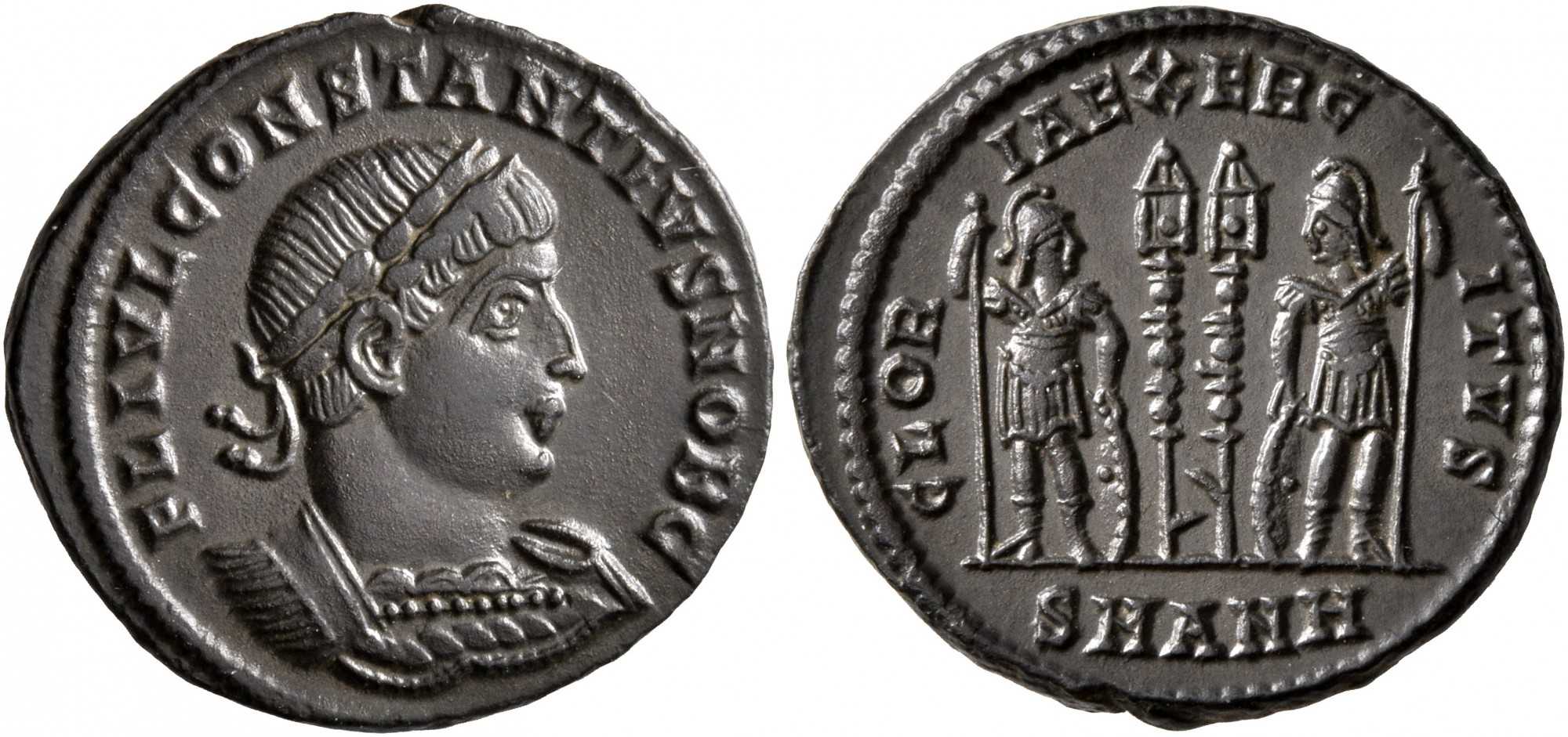 FLIVLCONSTANTINVSNOBC [FL IVL CONSTANTINVS (sic!) NOB C]; bust r., laur., cuir.