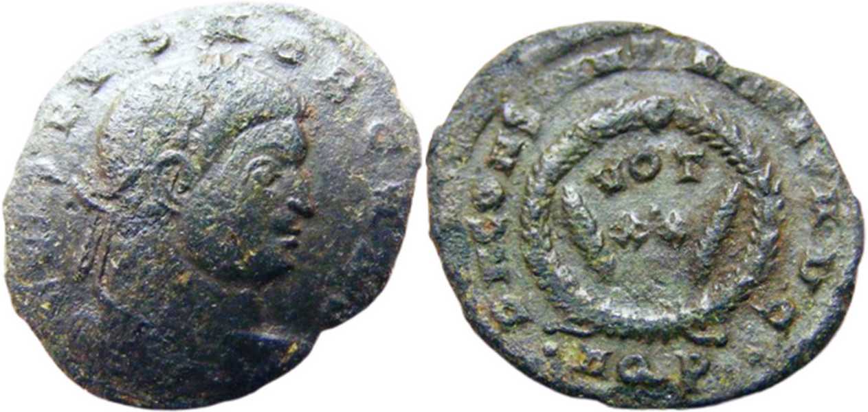 DNCONSTANTINIMAXAVG [D N CONSTANTINI MAX AVG]; laurel wreath enclosing VOT/XX. Branch on both sides. AQP in exergue [AQUILEIA 104].