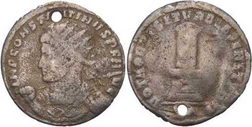 Note also Bruun's thorough, albeit a bit strange, commentary in footnote 83 on p. 403: "This bust has usually been interpreted as rad. with spear across r. shoulder (Gnecchi i, p. 59, no. 27; cf. also Cohen 718 with an erroneous reference to P). That would have been a unique Constantinian obv. bust. The bust L5 l., however, was fairly frequent on gold multiples before and after Civil War II, and in addition was obviously designed for the two Vota orbis types, as the obvv. of Crispus and Constantine II prove (see list above). The obv. is so worn that the raised hand can well be thought to have held a spear, though nothing of the spear can be seen".