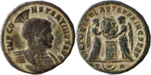 VICTORIAELAETAEPRINCPERP [VICTORIAE LAETAE PRINC PERP]; two Victories facing one another, holding on column shield inscribed VOT/PR. Decorated altar. P star over crescent A in exergue.