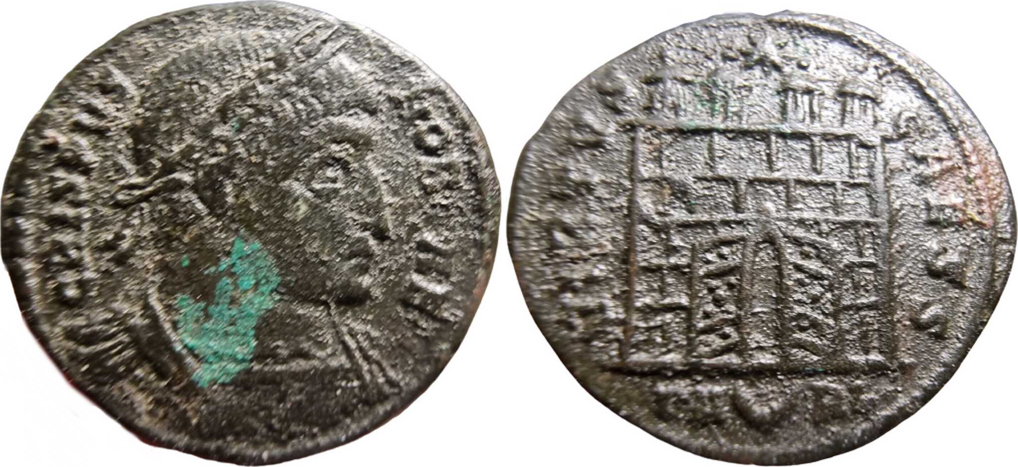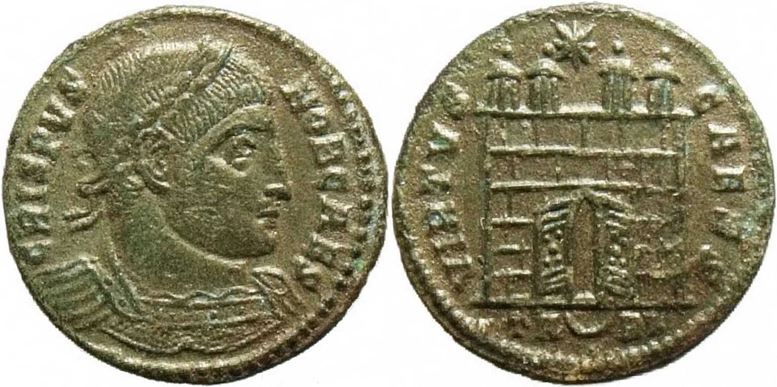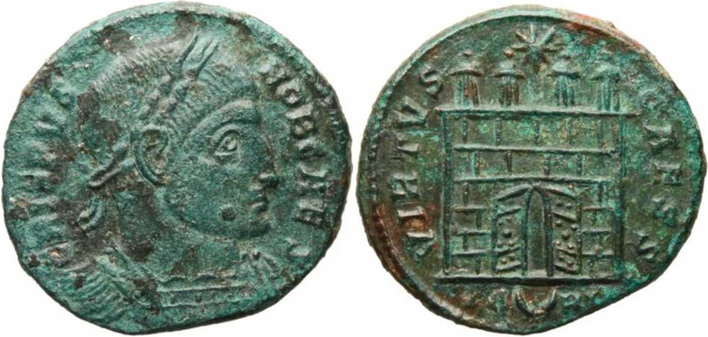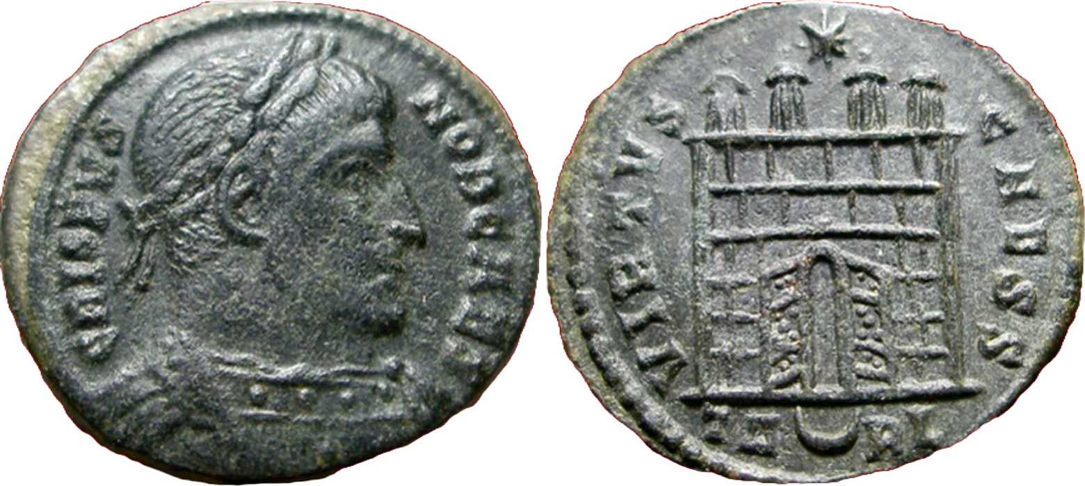 VIRTVS-CAESS [VIRTVS CAESS]; gateway with wide open doors of varying design, four turrets, varying number of stone layers, star above. TA[crescent]RL in exergue.
