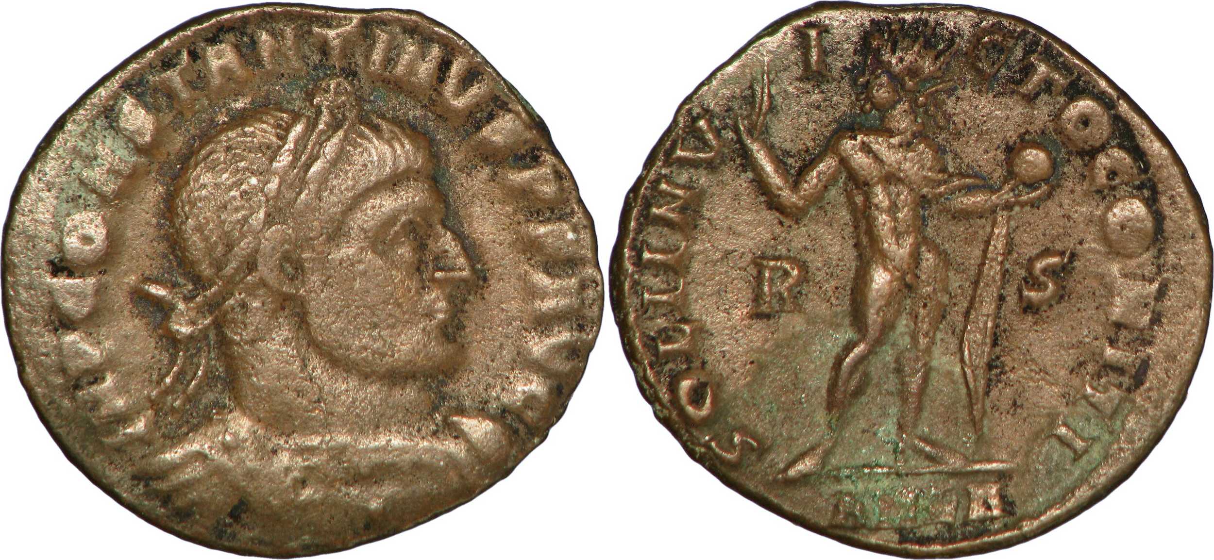 SOLIINV-I-CTOCOMITI [SOLI INVICTO COMITI]; Sol stg. r., looking l., chlamys across l. shoulder, globe in l. hand, raising r. R in left field, S in right field. ARLΔ in exergue.