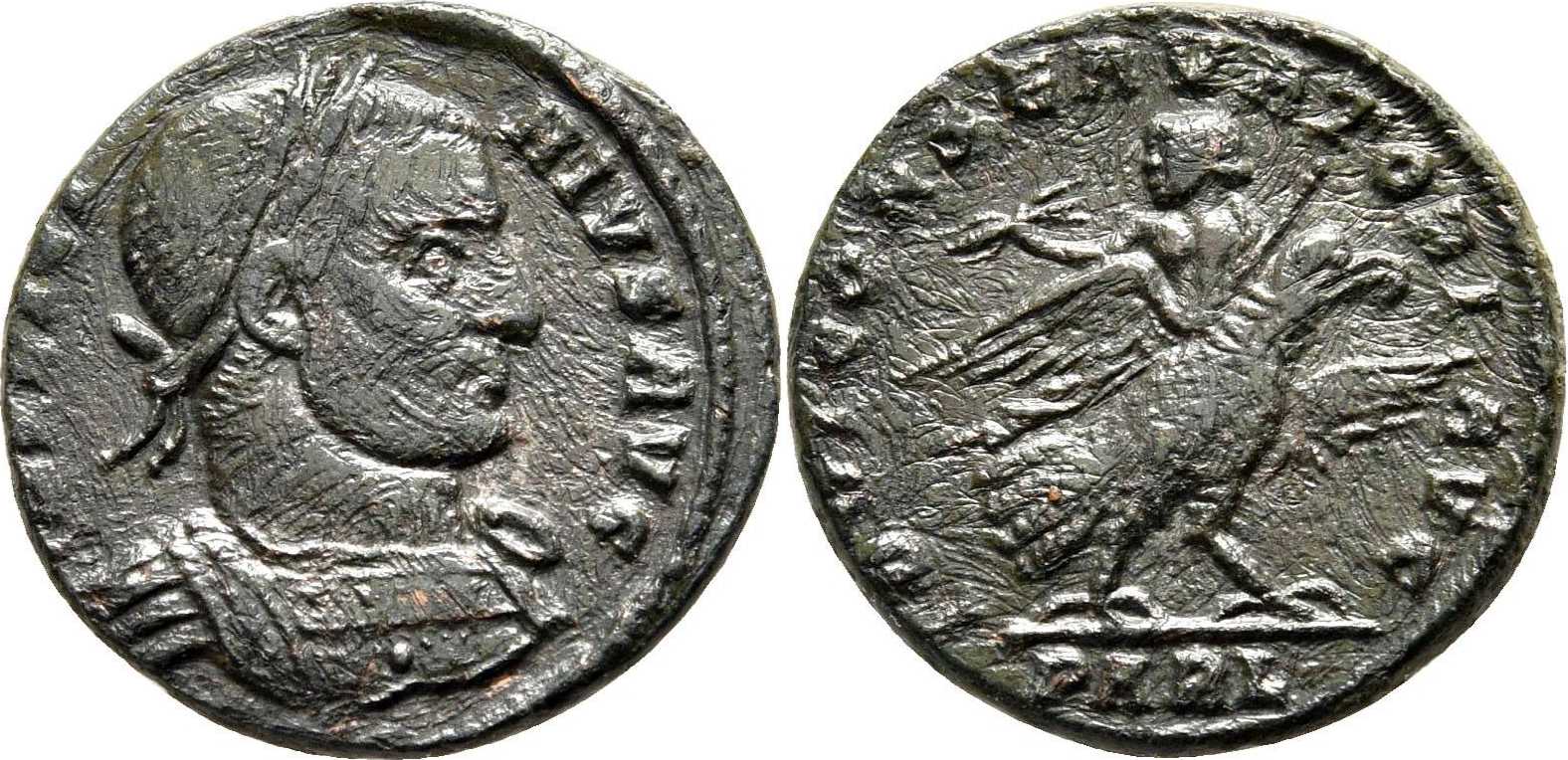 IOVICONSERVATORI-AVG [IOVI CONSERVATORI AVG]; Emperor borne by eagle stg. r., r. wings pointing horizontally, looking back; Emperor holds sceptre in l. hand and thunderbolt in r. PARL in exergue.