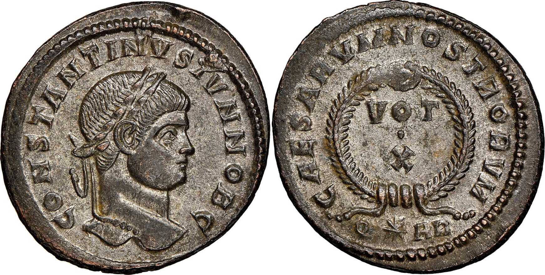 CAESARVMNOSTRORVM [CAESARVM NOSTRORVM]; in laurel wreath VOT/X. Q*AR in exergue.