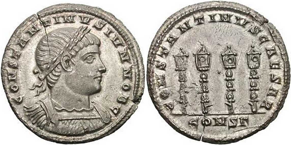 CONSTANTINVSCAESAR [CONSTANTINVS CAESAR]; four standards. CONSΓ in exergue.