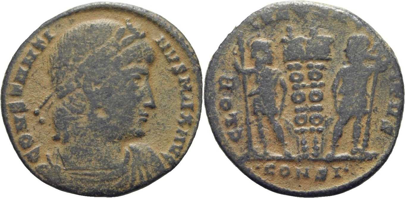 GLOR-IAEXERC-ITVS [GLORIA EXERCITVS]; two soldiers helmeted, stg. facing one another, reversed spear in outer hands, inner hands on shields resting on ground; between them two standards. CONSI in exergue.