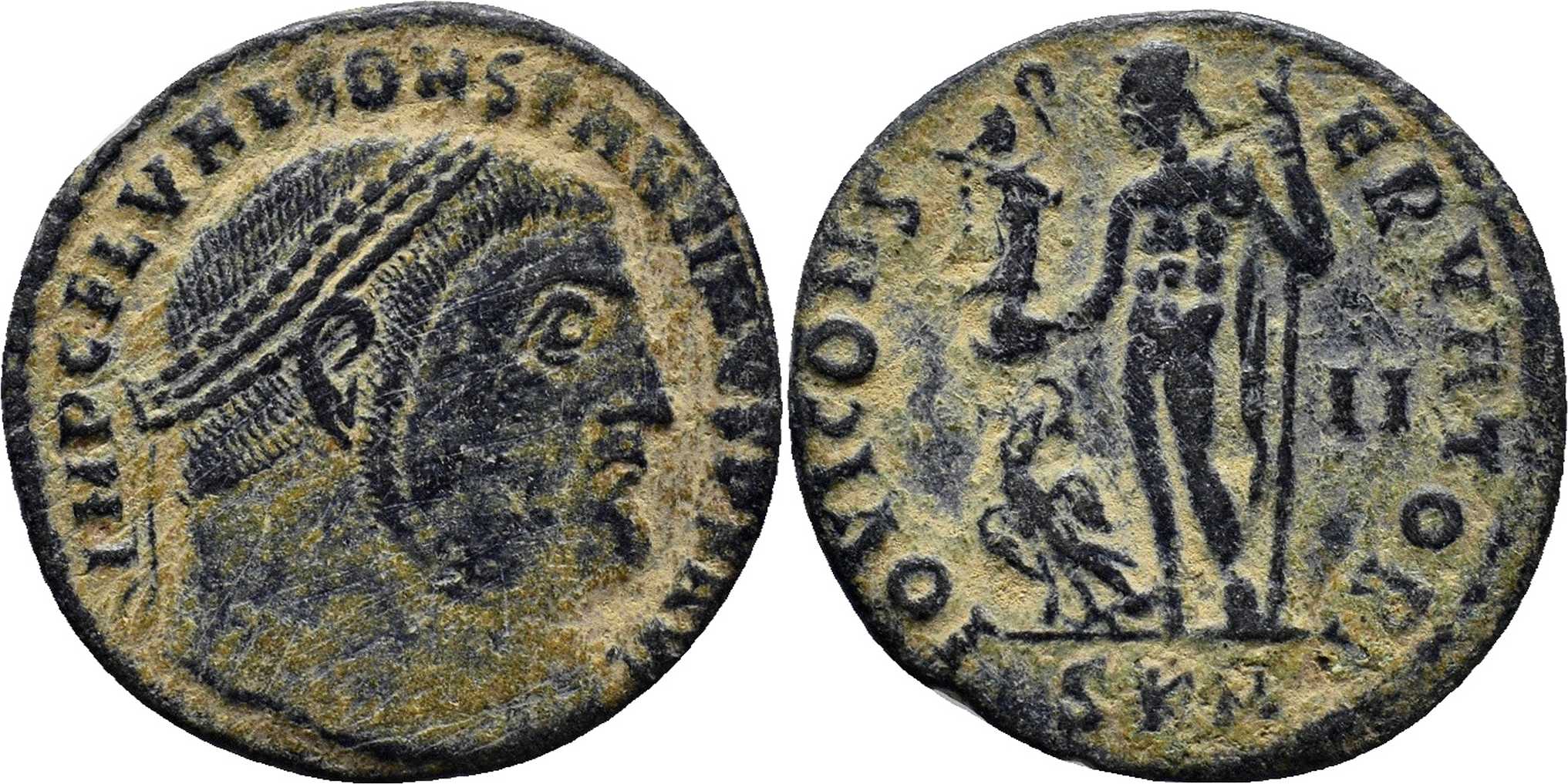 IOVICONS-ERVATORI [IOVI CONSERVATORI]; Jupiter stg. l., chlamys across l. shoulder, holding sceptre, Victory on globe in r. hand; eagle with wreath to l. on ground. II in right field. SKM in exergue.