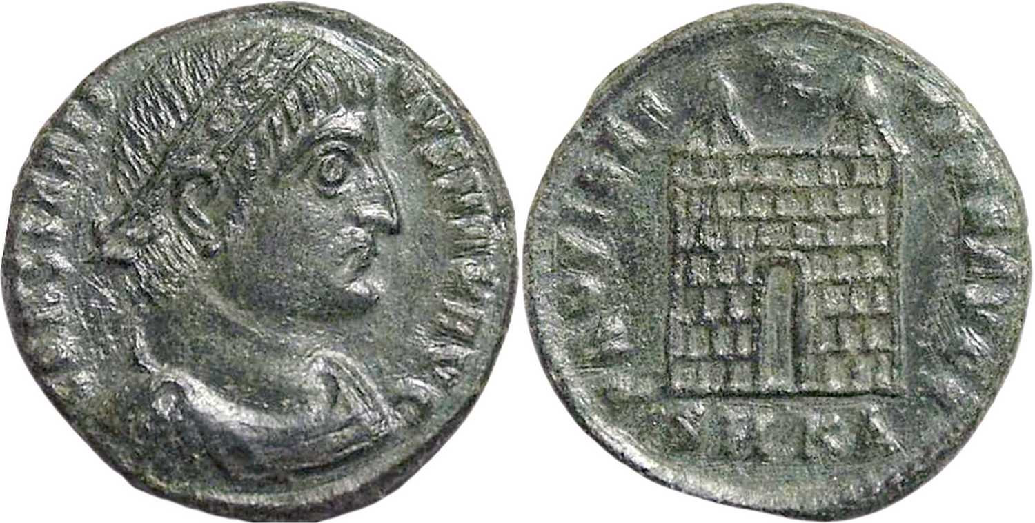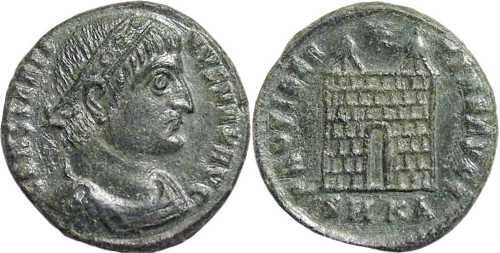 PROVIDEN-TIAEAVGG [PROVIDENTIAE AVGG]; camp gate, two turrets, no doors, star above, varying number of stone layers. SMKA in exergue.