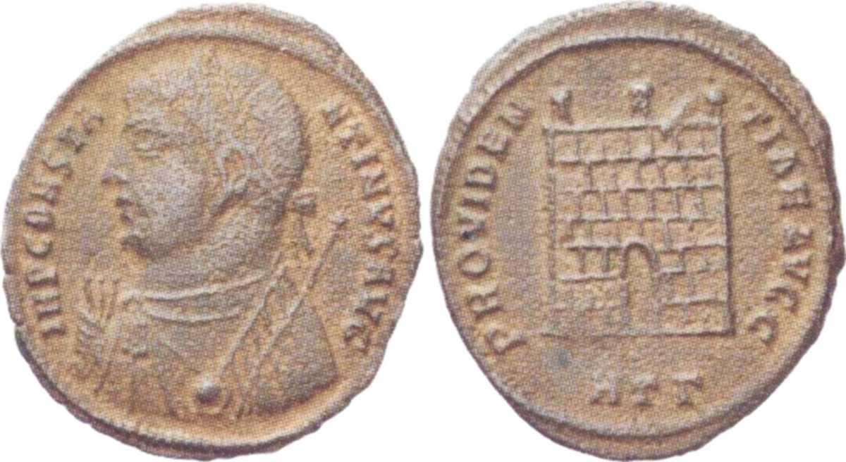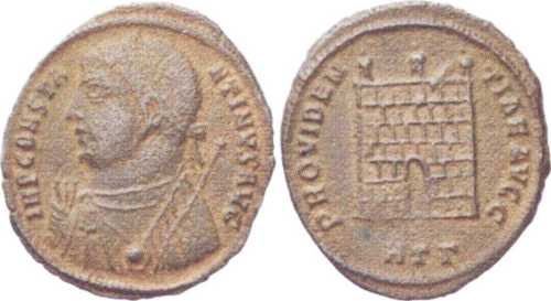IMPCONSTA-NTINVSAVG [IMP CONSTANTINVS AVG]; bust l., laur., dr., globe, sceptre in l. hand, thunderbolt (?) in r. hand.