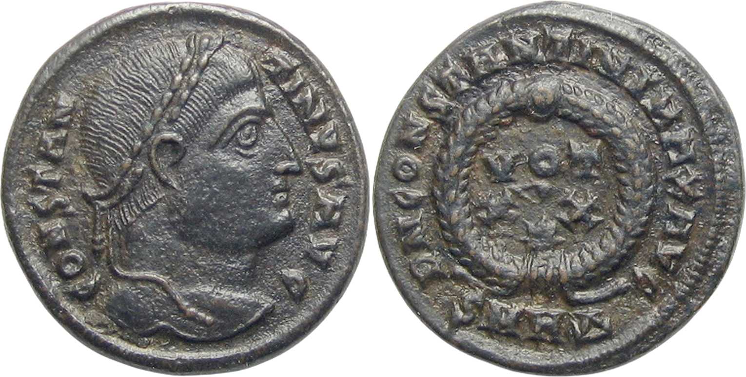 CONSTAN-TINVSAVG [CONSTANTINVS AVG]; head r., laur., looking upwards [B2].