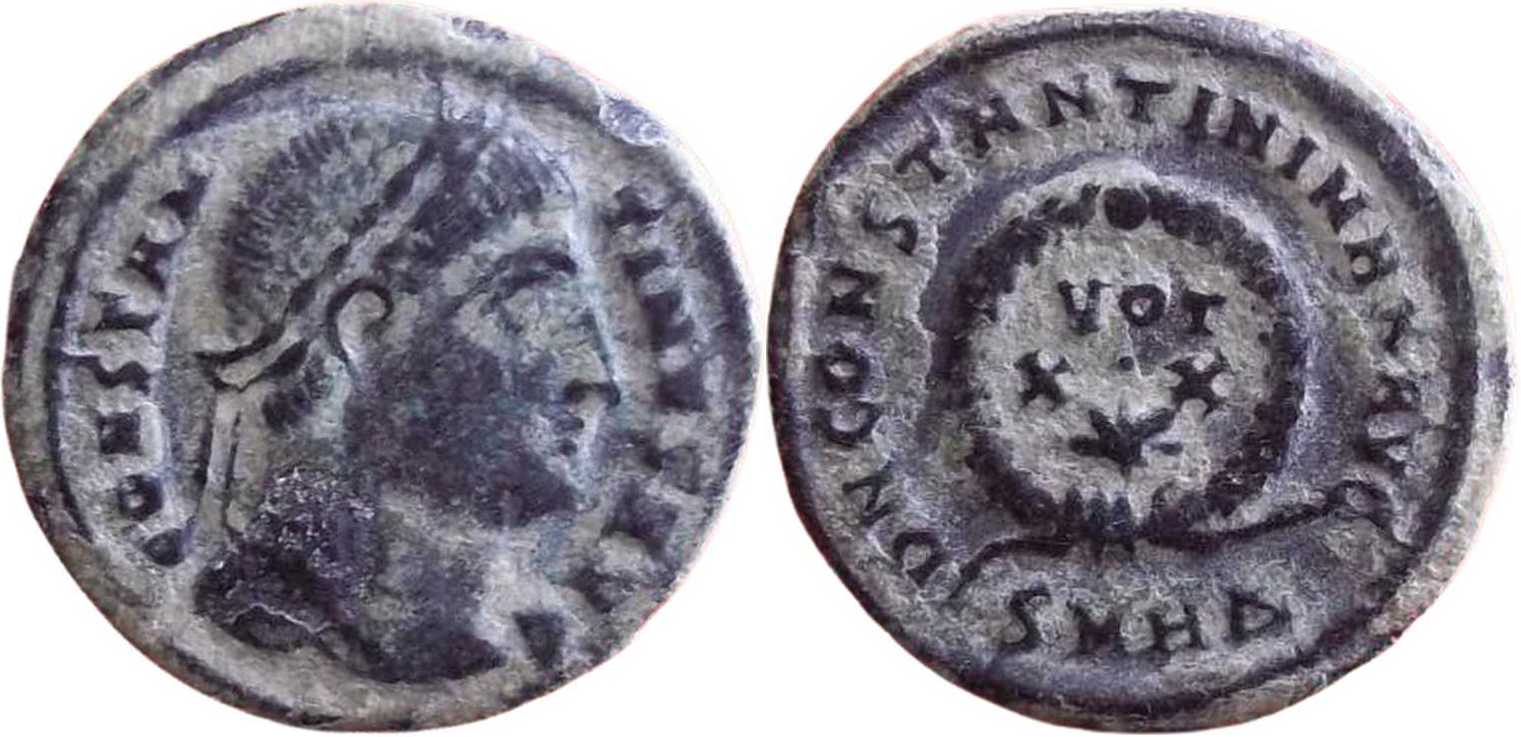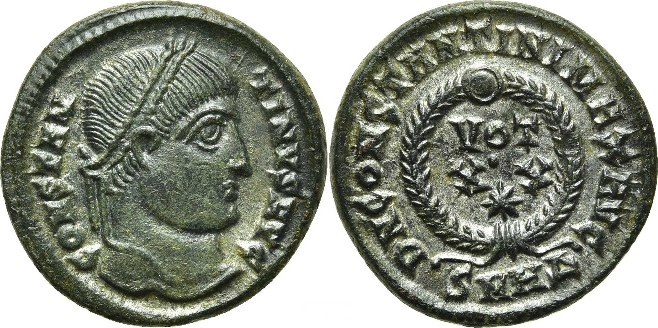 DNCONSTANTINIMAXAVG [D N CONSTANTINI MAX AVG]; laurel wreath enclosing VOT/XX. Star in middle field. SMHΔ in exergue.