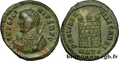 PROVIDEN-TIAECAESS [PROVIDENTIAE CAESS]; camp gate with three turrets, no doors; varying number of stone layers. MHTЄ in exergue [HERACLEA 20].