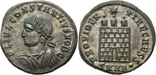 PROVIDEN-TIAECAESS [PROVIDENTIAE CAESS]; camp gate with three turrets, no doors. Star in the middle field (over camp gate). SMHB in exergue.