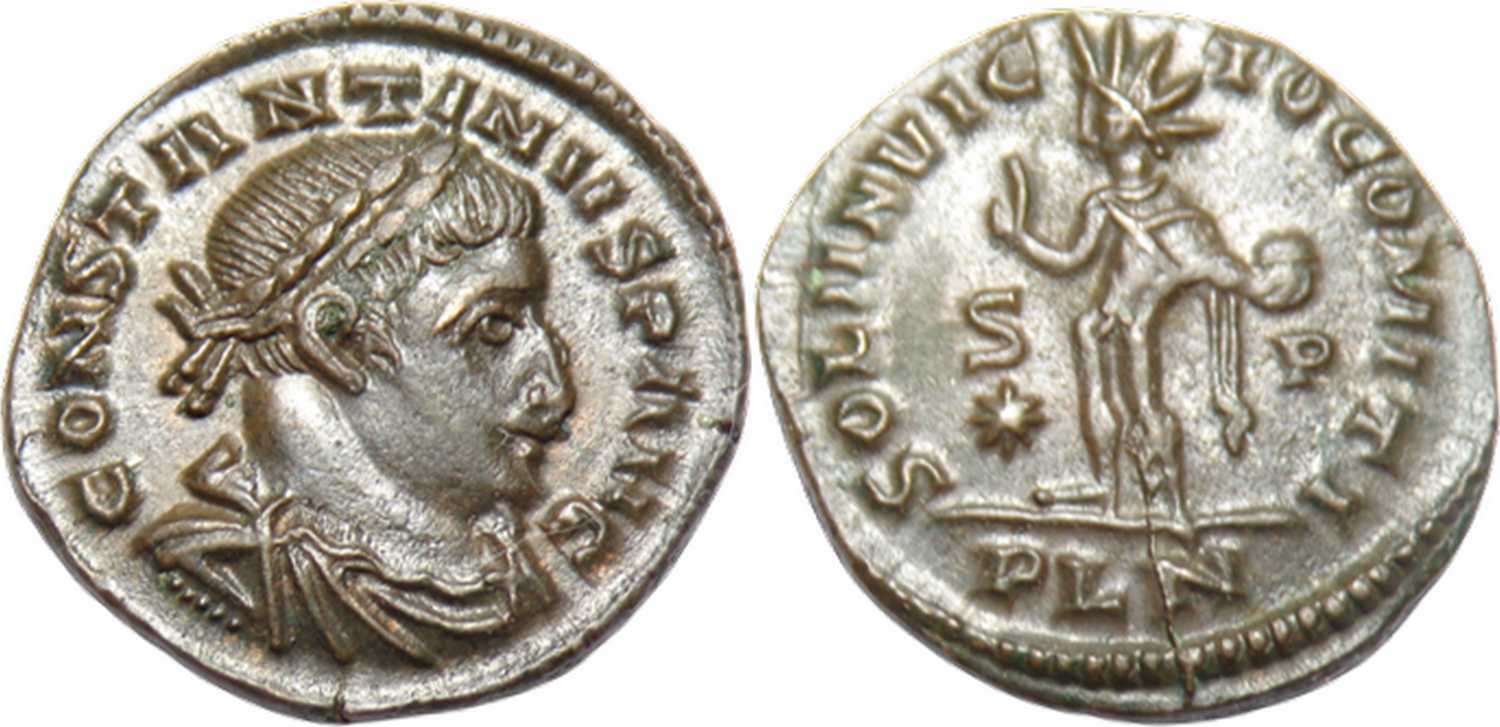 SOLIINVIC-TOCOMITI [SOLI INVICTO COMITI]; Sol stg. l., chlamys across l. shoulder, raising r. hand, globe in l. S over star in left field, P in right field. PLN in exergue.
