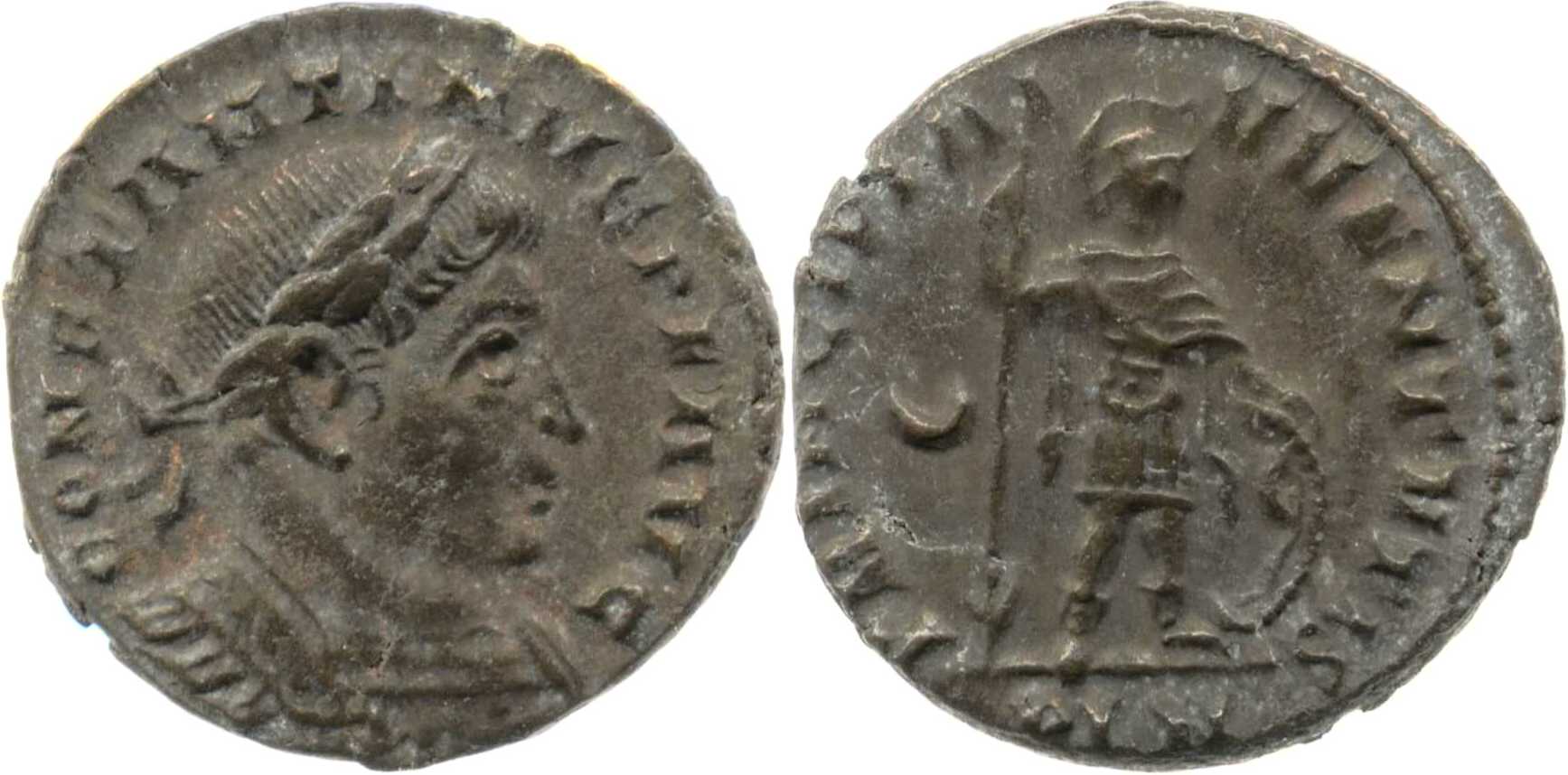PRINCIPIA-IVVENTVTIS [PRINCIPIA IVVENTVTIS]; prince, helmeted, in military dress, stg. r., cloak spread, leaning on reversed vertical spear, hand resting on shield. Crescent in left field. PLN in exergue.