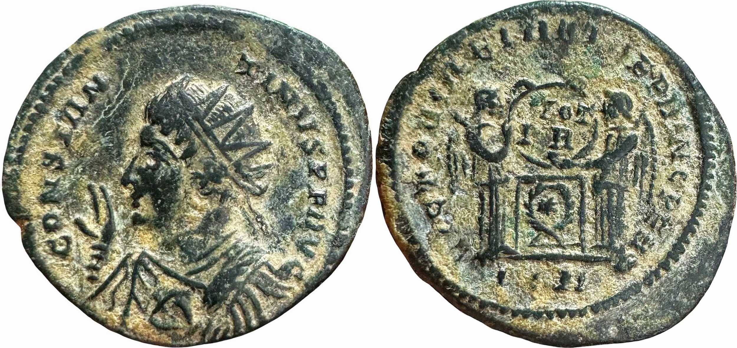 CONSTAN-TINVSPFAVG [CONSTANTINVS P F AVG]; bust l., rad., dr., cuir., raising r. hand, globe in l. hand.
