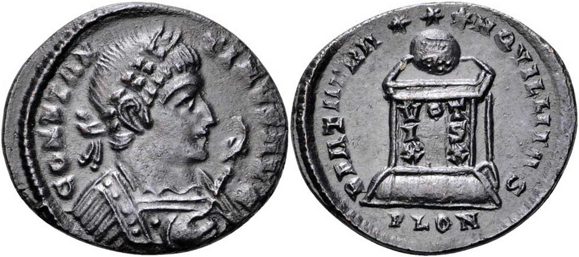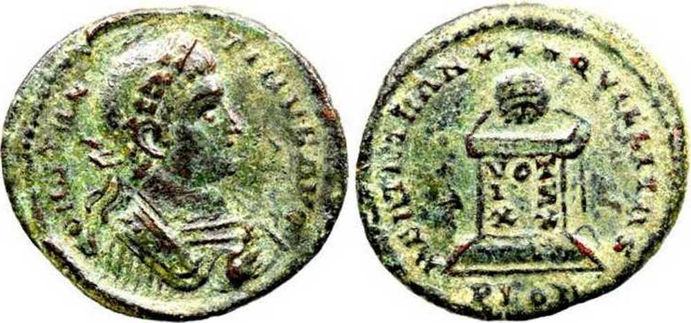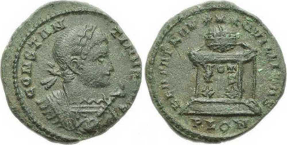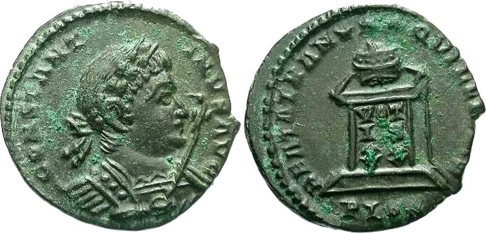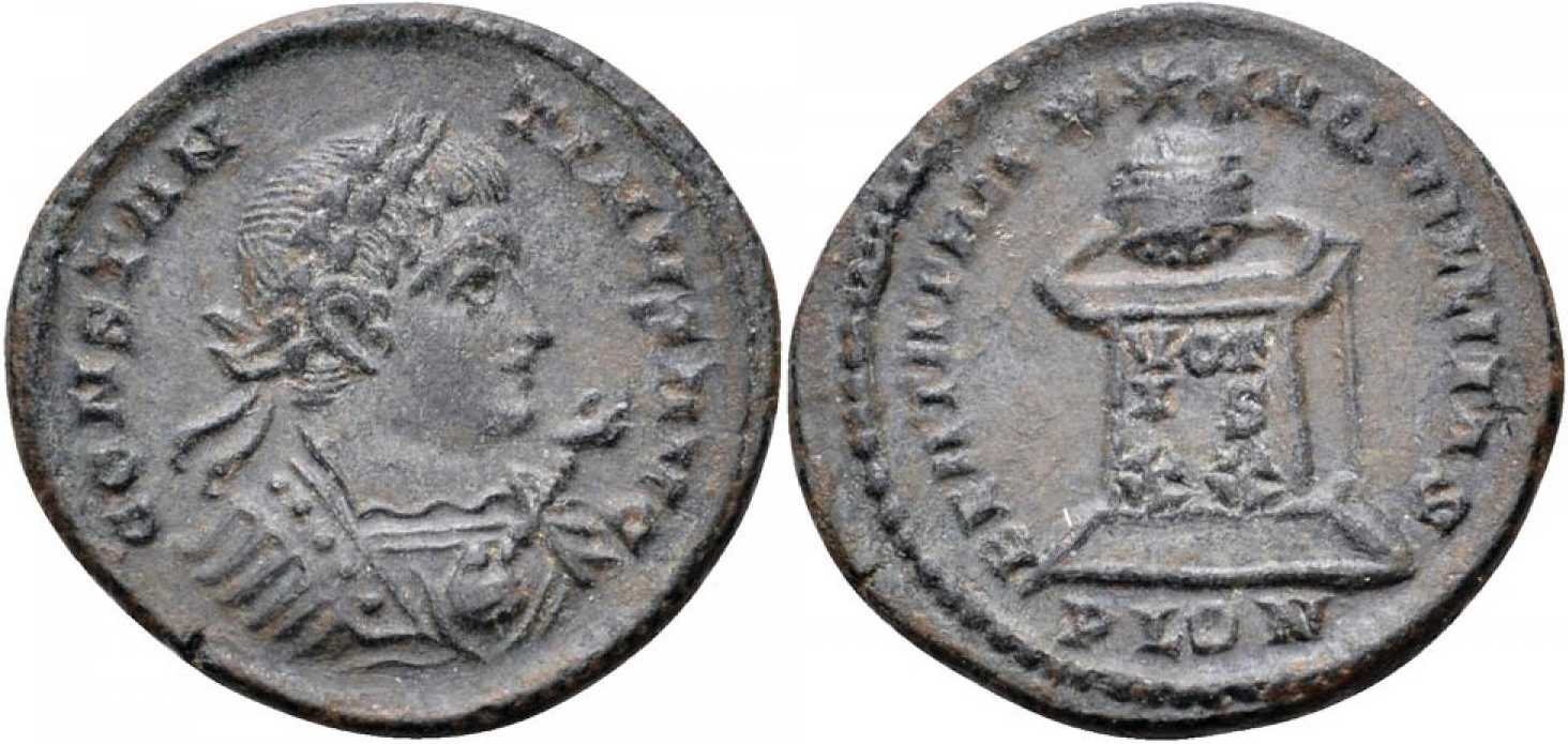 - from FORVM ANCIENT COINS; weight 2.72 g; diameter 19 mm; obv. legend break T-I; rev. legend break N-Q [click for picture];