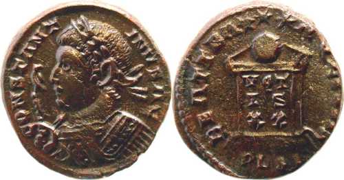 CONSTANT-INVSAG [CONSTANTINVS AG]; bust l., laur., cuir., eagle-tipped sceptre in r. hand [K2 l.].