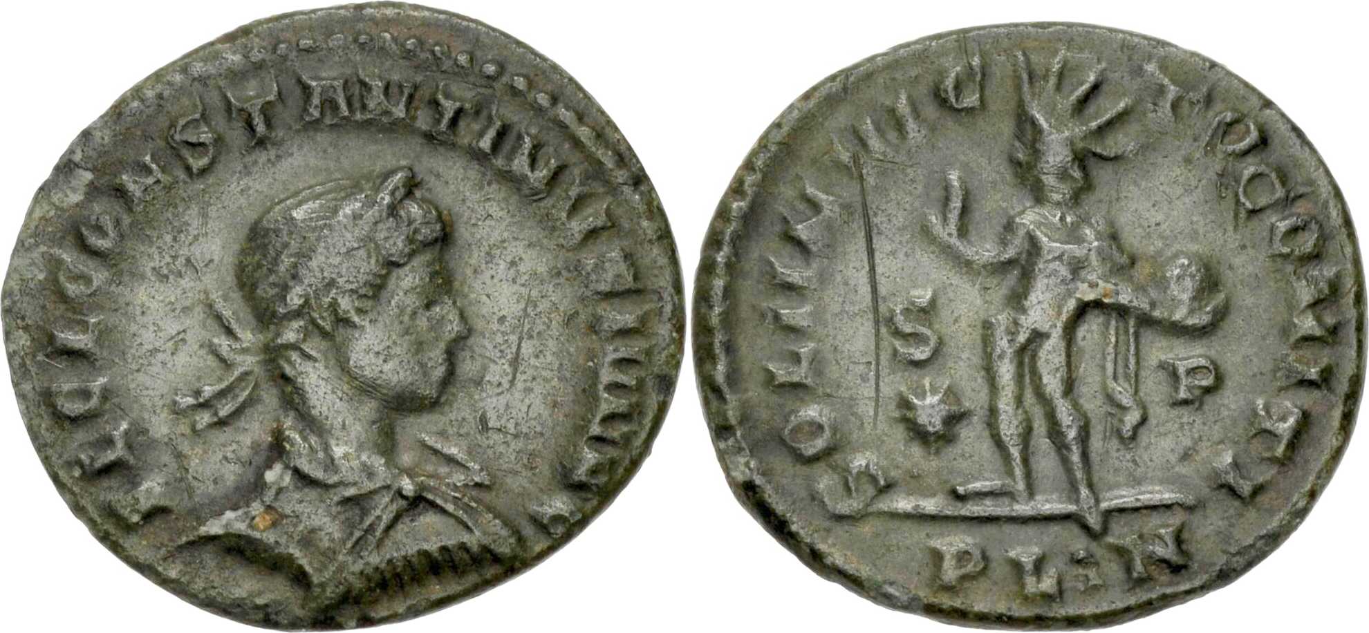 SOLIINVIC-TOCOMITI [SOLI INVICTO COMITI]; Sol stg. l., chlamys across l. shoulder, raising r. hand, globe in l. S over star in left field, P in right field. PL:N in exergue.
