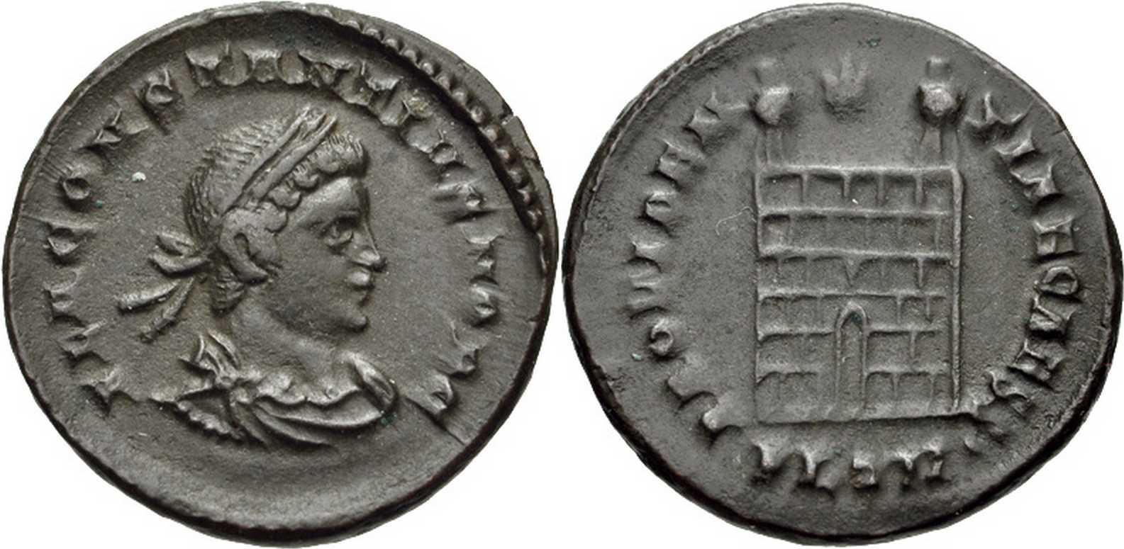 PROVIDEN-TIAECAESS [PROVIDENTIAE CAESS]; camp gate, two turrets, no doors, star above, varying number of stone layers. PLON in exergue.