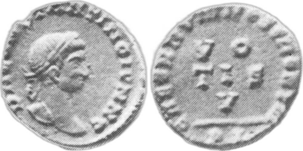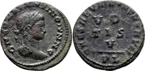 UNLISTED FOR RULER. RIC lists this issue only for Constantine I and Crispus (p. 128). Listed in Bastien Lyon (318-337) (p. 143, no. 40a) but erroneously attributed to the previous issue with m.m. which follows line of circular inscription.