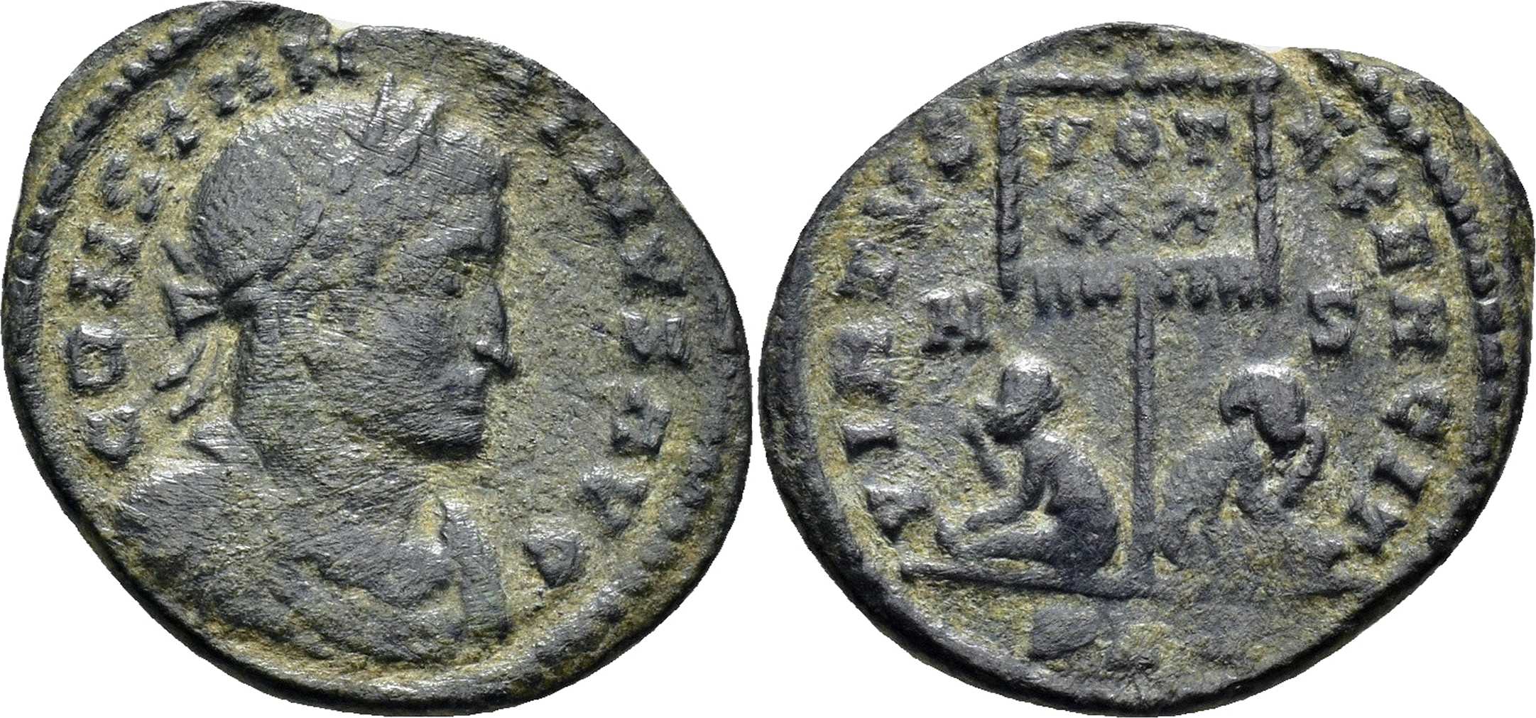 VIRTVS-EXERCIT [VIRTVS EXERCIT]; standard inscribed VOT/XX in two lines, captive std. on ground on either side. A in left field, S in right field. PLG in exergue.