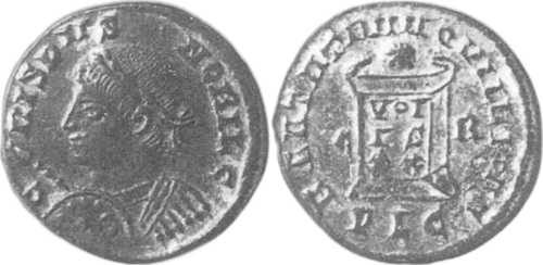 C-RISPVS-NOBILC [CRISPVS NOBIL C]; bust l., laur., cuir. with spear pointing forward, shield on l. arm [G8 l.].
