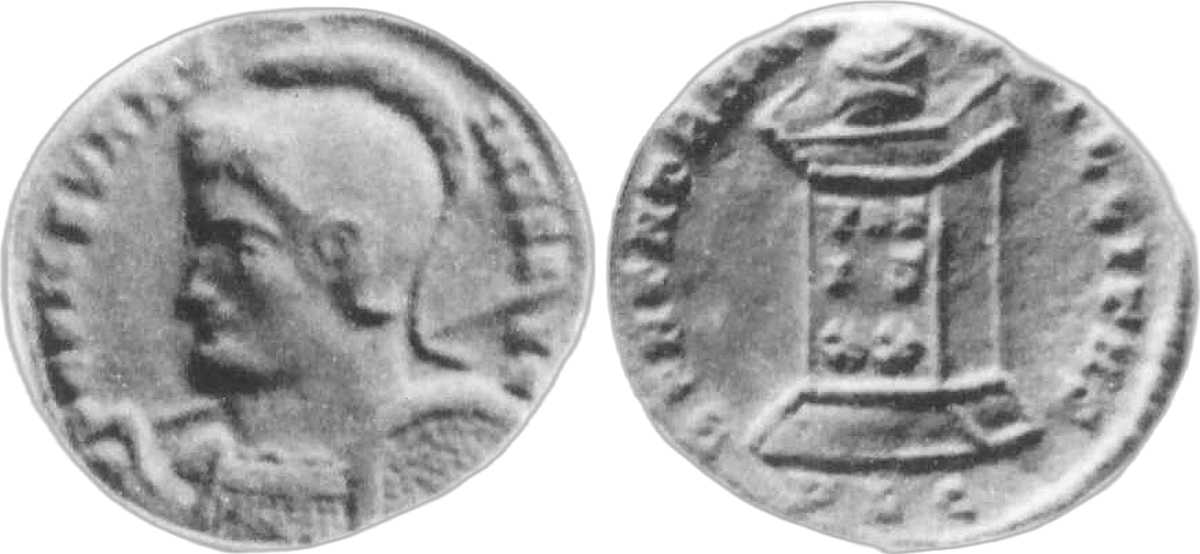CONSTANT-INVSA-VG [CONSTANTINVS AVG]; bust l., helmeted, cuir., spear across r. shoulder, shield on l. arm [H2 l.].