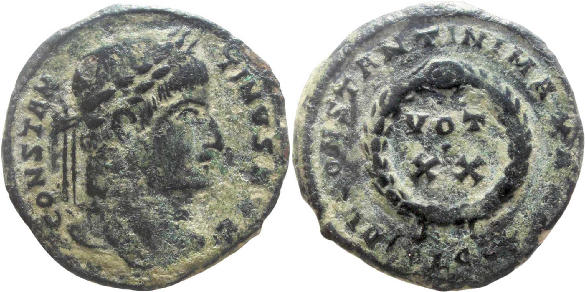 DNCONSTANTINIMAXA[VG] [D N CONSTANTINI MAX AVG]; laurel wreath enclosing VOT/XX in two lines. PLG[crescent] in exergue.