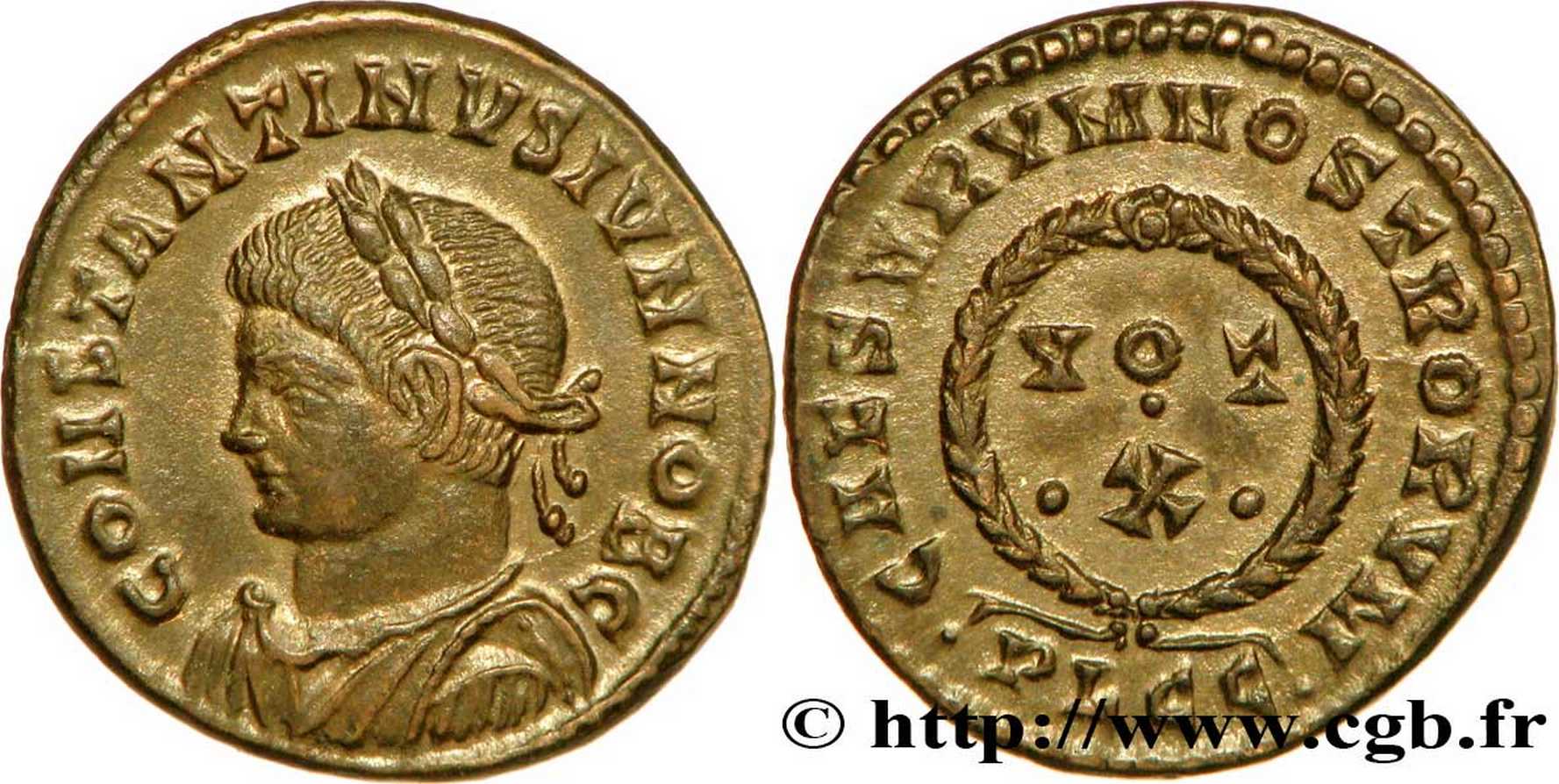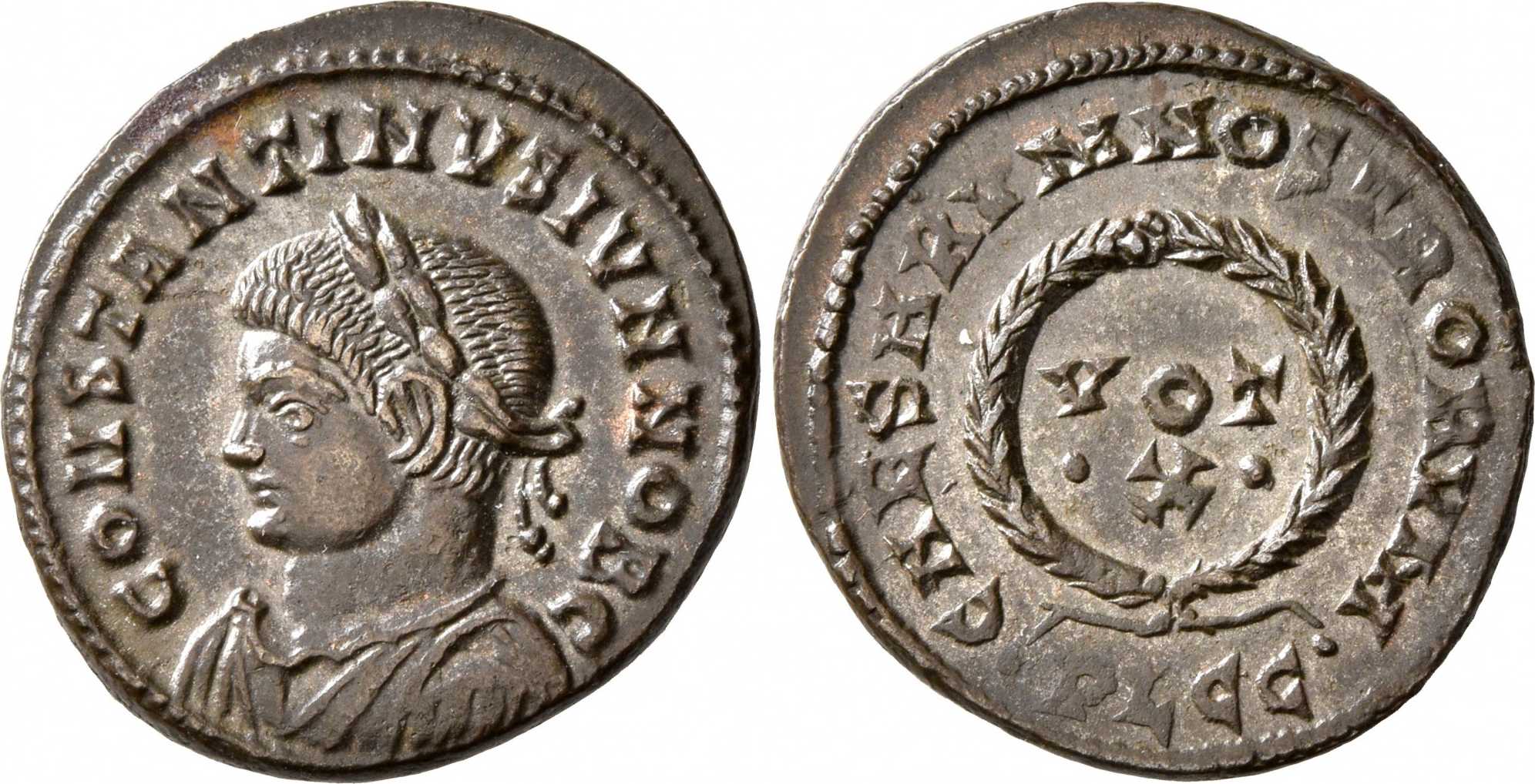 CONSTANTINVSIVNNOBC [CONSTANTINVS IVN NOB C]; bust l., laur., dr., cuir.