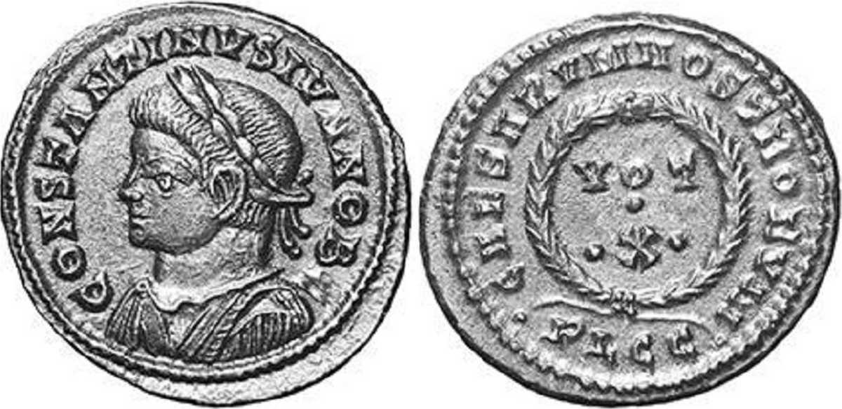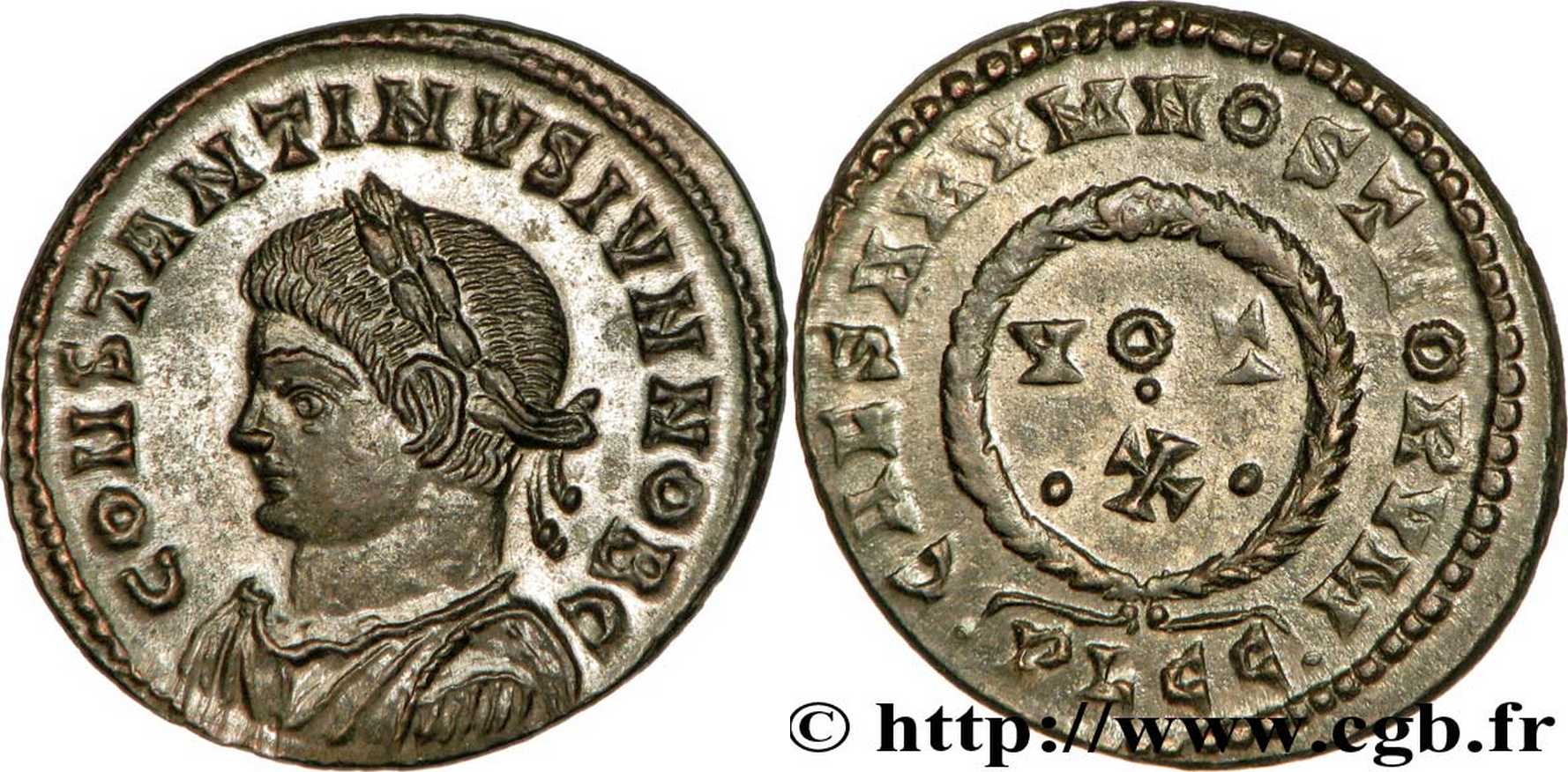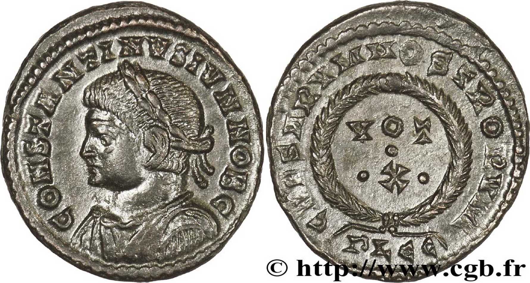 CAESARVMNOSTRORVM [CAESARVM NOSTRORVM]; laurel wreath enclosing VOT//X in three lines. PLGC in exergue.