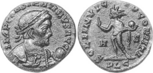 SOLIINVIC-TOCOMITI [SOLI INVICTO COMITI]; Sol stg. l., chlamys across l. shoulder, raising r. hand, globe in l. hand. A in left field, S in right field. PLG in exergue.