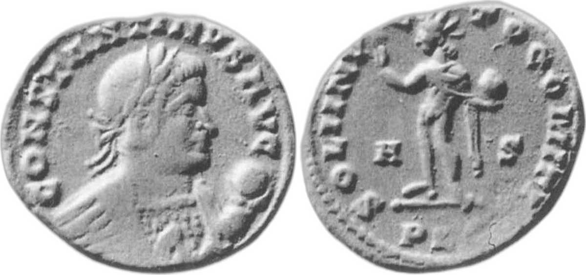 CON[STANTIN]VSAVG [CONSTANTINVS AVG]; bust r., laur., cuir., raising r. hand, globe in l. hand [L3 var.].
