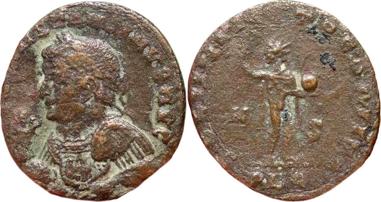 SOLIINVIC-TOCOMIT[I] [SOLI INVICTO COMITI]; Sol stg. r., looking l., chlamys hanging behind, raising r. hand, globe in l. A in left field, S in right field. PLG in exergue.
