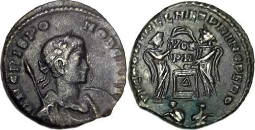 DNCRISPO-NOBCAES [D N CRISPO NOB CAES]; bust r., laur., dr., cuir., spear across r. shoulder, shield on l. arm [G5 var.].