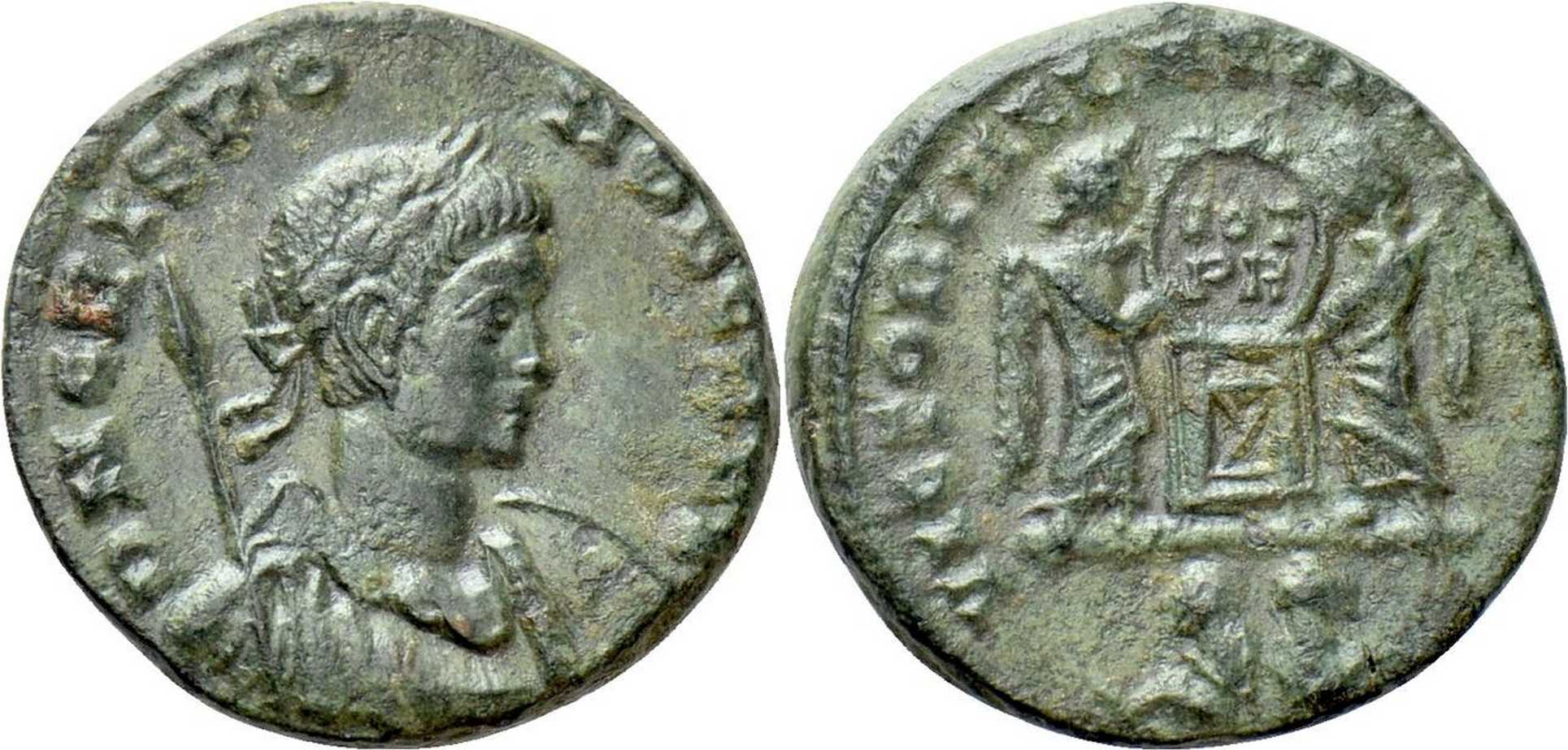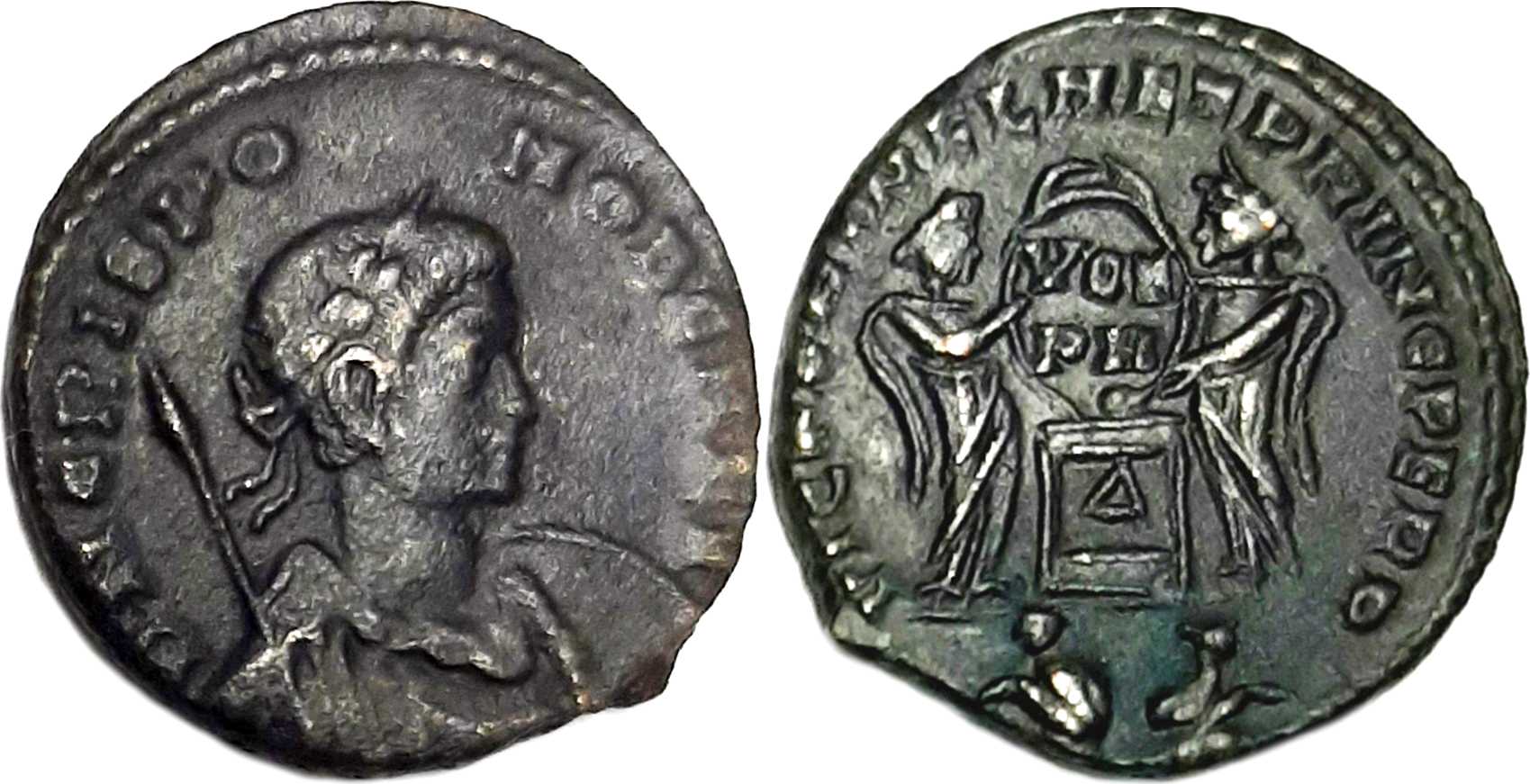 VICTORIAELAETPRINCPERP [VICTORIAE LAET PRINC PERP]; two Victories facing one another, holding shield inscribed VOT/PR over altar of varying design. Two captives in exergue.