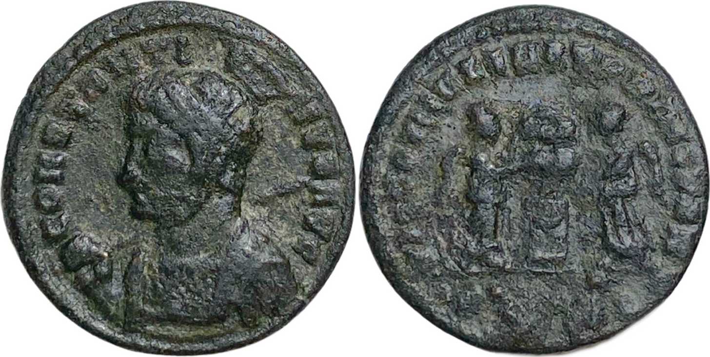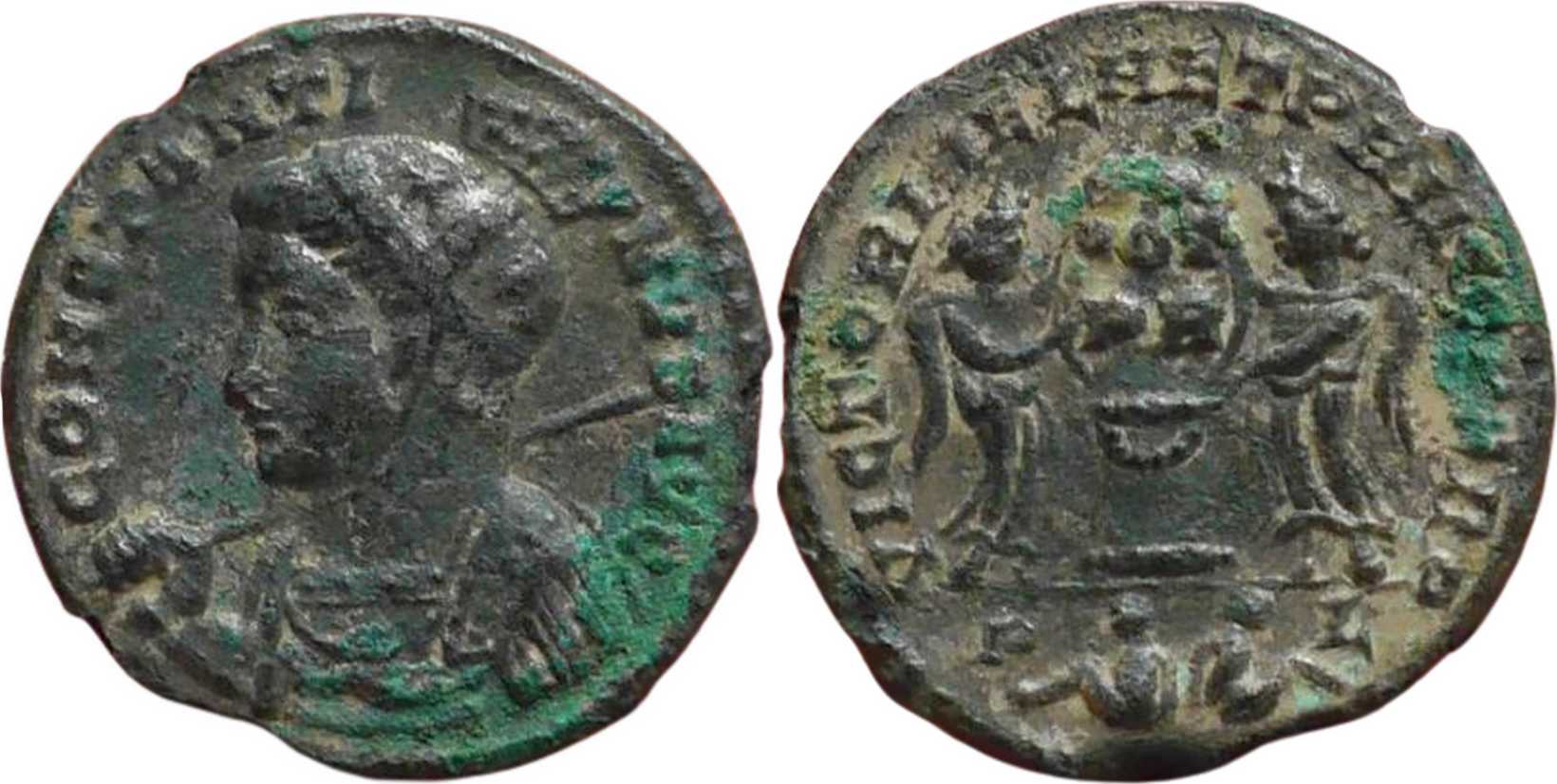 CONSTANTI-NVSAVG [CONSTANTINVS AVG]; bust l., high-crested helmet, cuir., sceptre across r. shoulder [H11 l. var.].