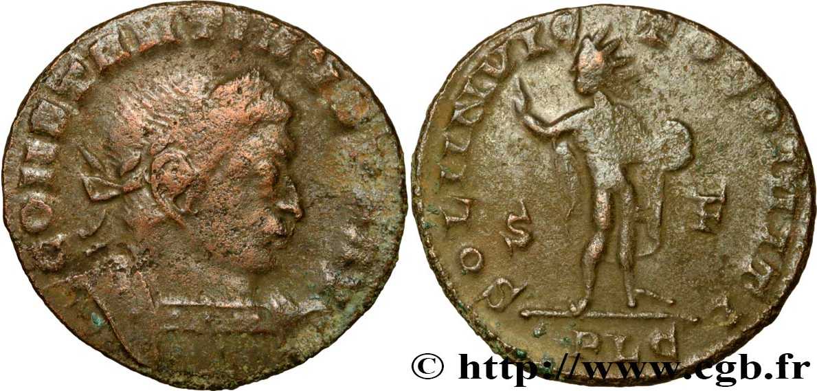 SOLIINVIC-TOCOMITI [SOLI INVICTO COMITI]; Sol stg. r., looking l., raising r. hand, chlamys spread, holding globe. S in left field, F in right field. PLG in exergue.