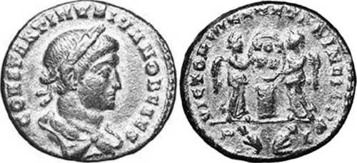 CONSTANTINVSIVNNOBCAES [CONSTANTINVS IVN NOB CAES]; bust r., laur., dr., cuir., seen from back.