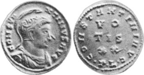 CONSTA-NTINVSAVG [CONSTANTINVS AVG]; bust r., helmeted, dr., cuir. [D1].