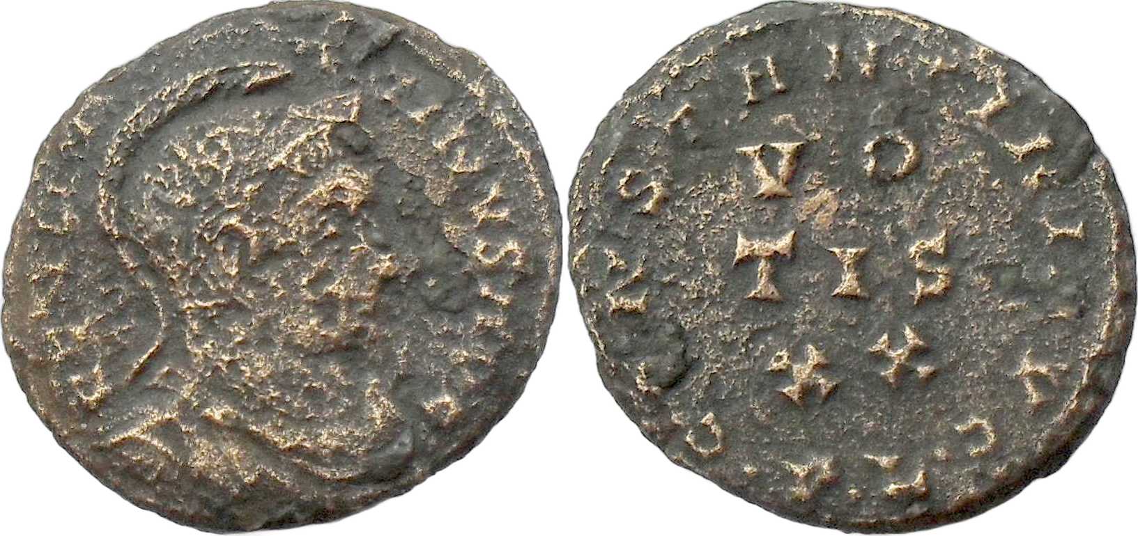 CONSTANTINIAVG [CONSTANTINI AVG]; around VO/TIS/XX in three lines; m.m. follows line of circular inscription. PL in exergue.