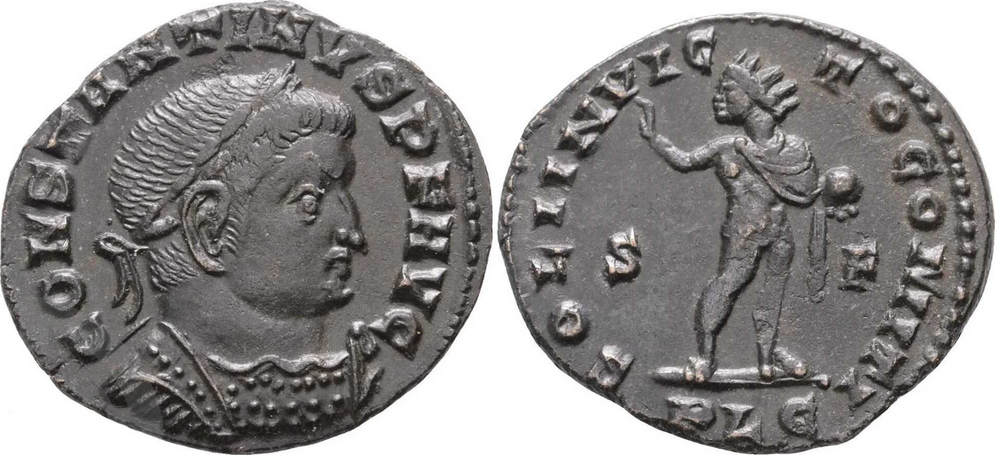 SOLIINVIC-TOCOMITI [SOLI INVICTO COMITI]; Sol stg. r., looking l., raising r. hand, chlamys across l. shoulder, holding globe. S in left field, F in right field. PLG in exergue.
