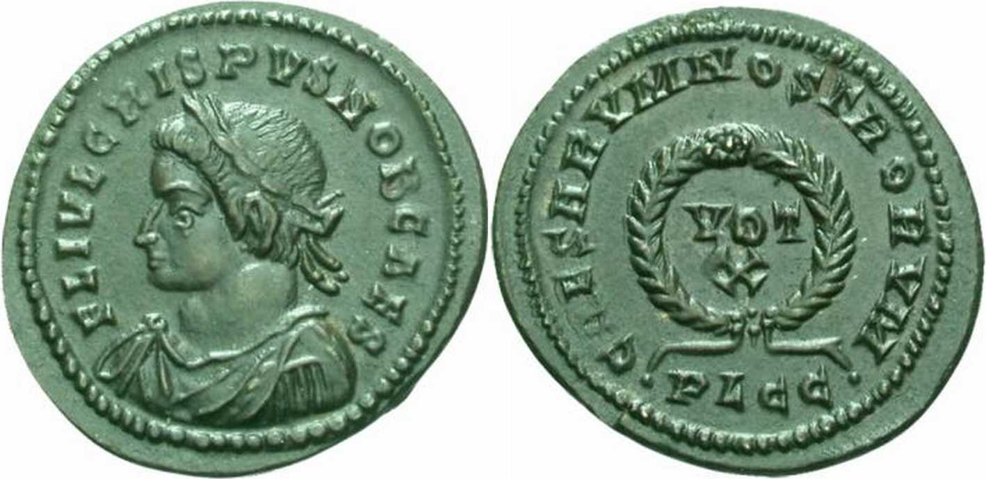 FLILCRISPVSNOBCAES [FL IL (sic!) CRISPVS NOB CAES]; bust l., laur., dr., cuir.