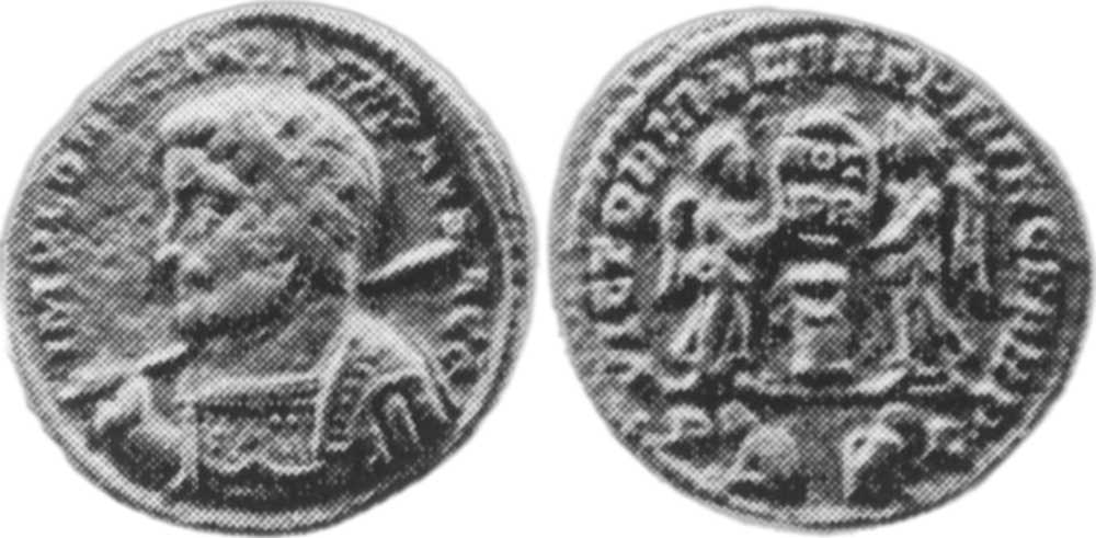 BUST TYPE VARIETY. Similar to H11 l. except for bust cuirassed and draped and parazonium (or pugio) in l. hand. Note that single specimen cited in RIC (and shown in Bastien Lyon (318-337); plate I, no. 15) as LYONS 78 is quite different: bust is cuirassed only and the left hand is not visible. Note also that reading of obv. legend is not certain: could be ...AG. For varieties of bust types H11 and H12 see also CORRIGENDA, VOL. VII, p. 89.