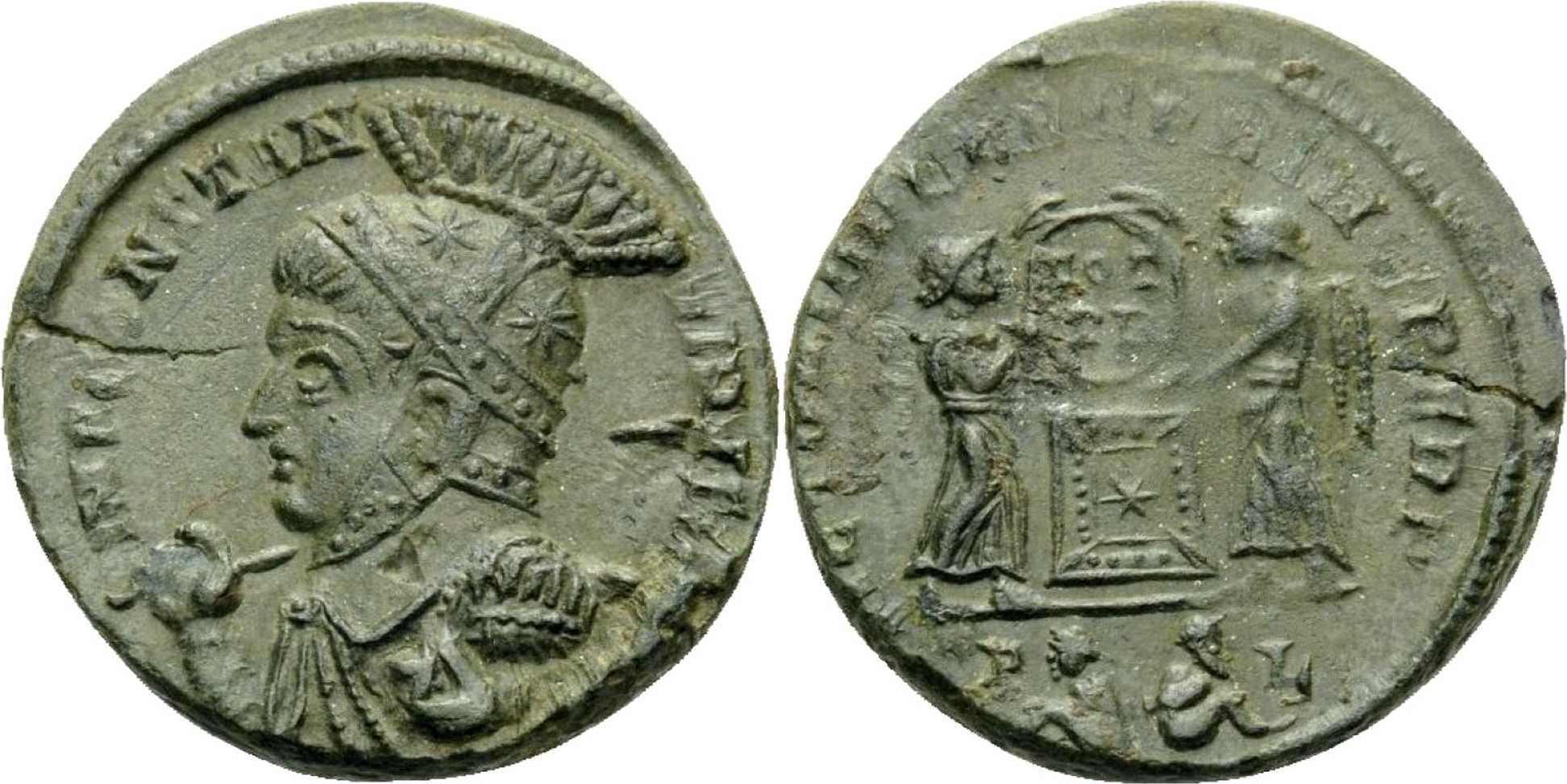 IMPCONSTAN-TINVSA[VG] [IMP CONSTANTINVS AVG]; bust l., high-crested helmet, dr., cuir., spear across r. shoulder, parazonium in l. hand.