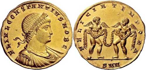 FLIVLCONSTANTIVSNOBC [FL IVL CONSTANTIVS NOB C]; bust r., laur., dr., cuir.